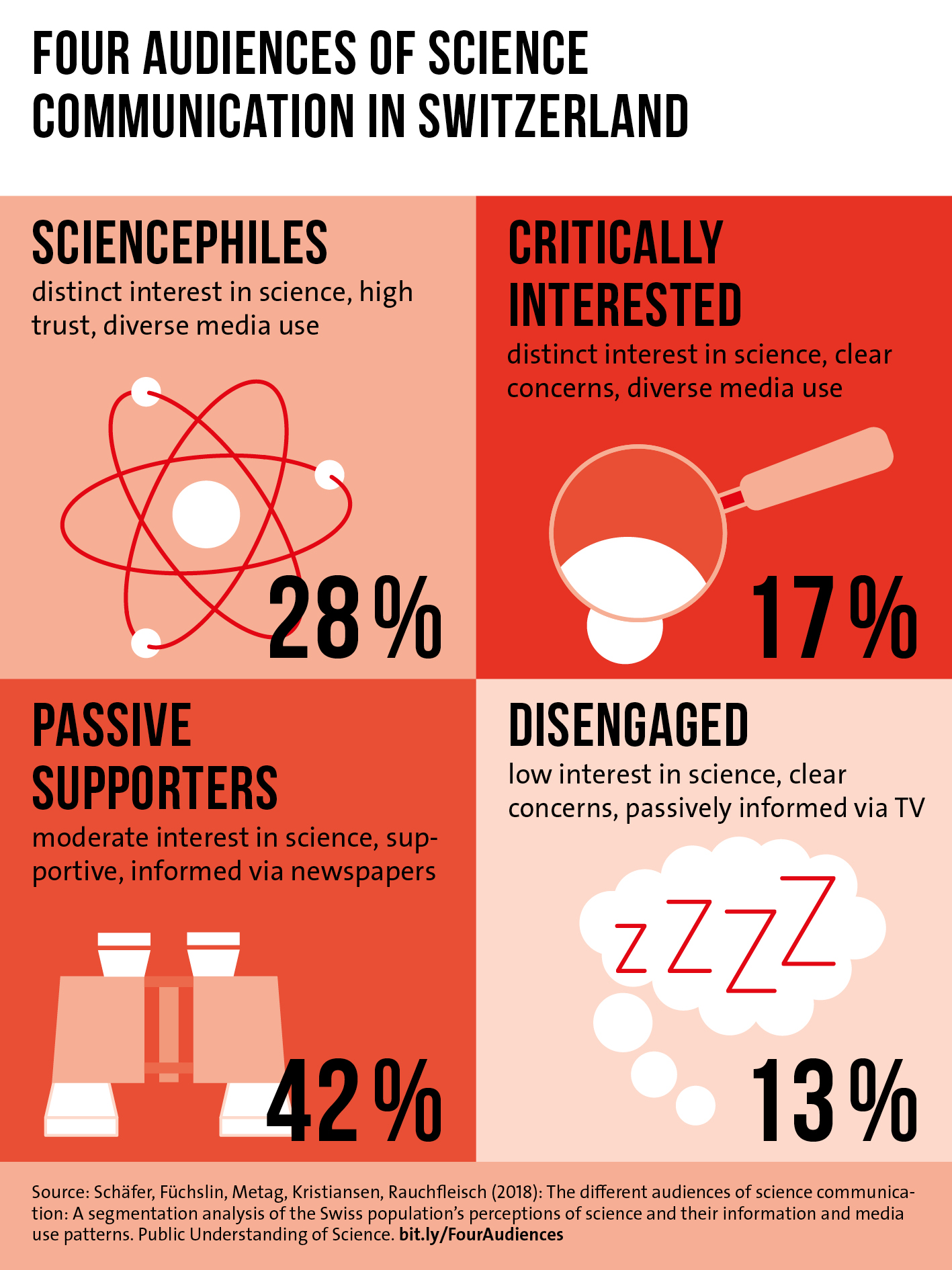 Mike Schäfer, Tobias Füchslin, Julia Metag, Silje Kristiansen, Arian Rauchfleisch. The different audiences of science communication: A segmentation analysis of the Swiss population’s perceptions of science and their information and media use patterns. Public Understanding of Science. January XX, 2018. DOI: 10.1177/0963662517752886
