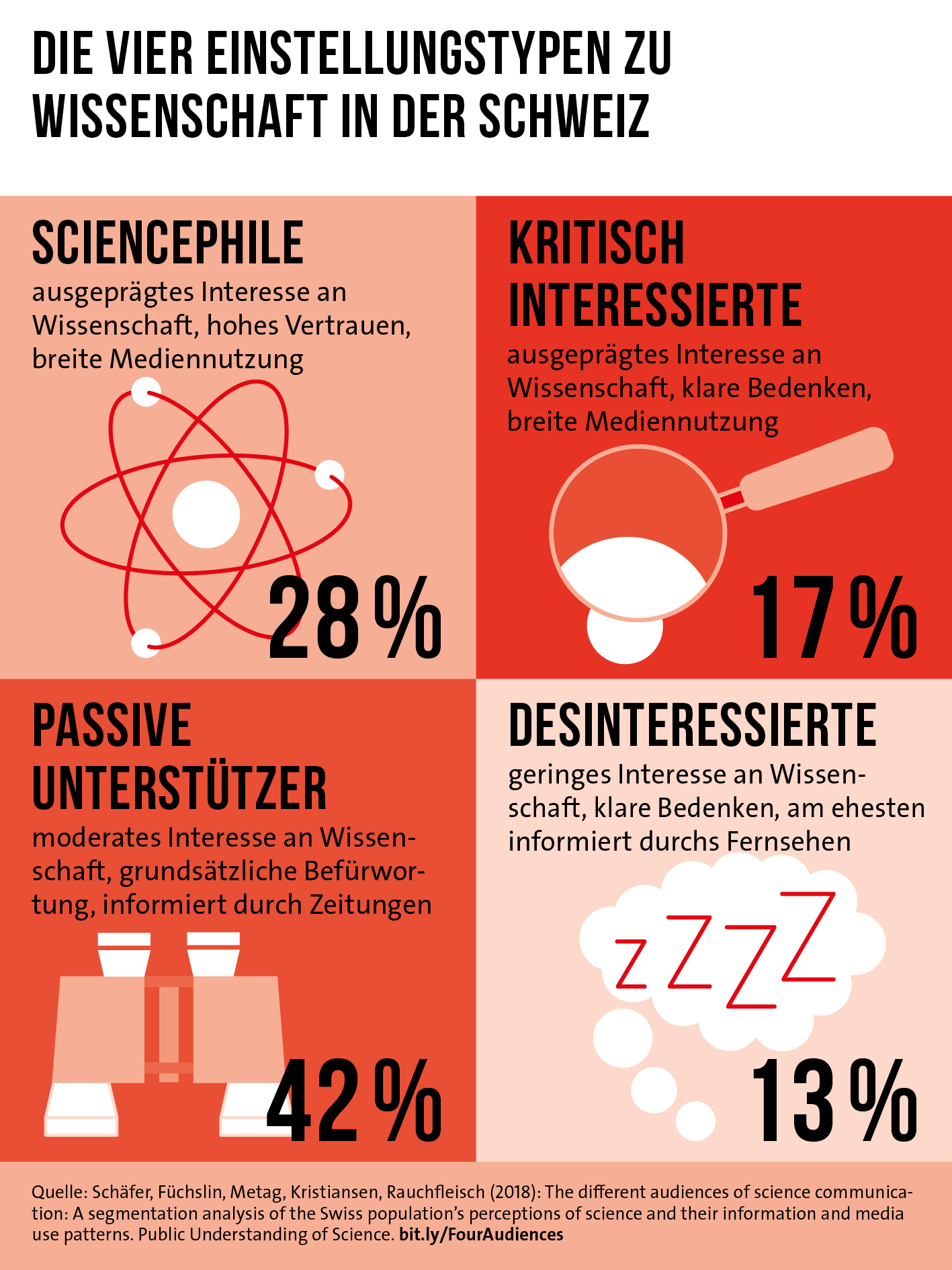 Zwei dieser Typen sind stark wissenschaftsinteressiert: Für die sogenannten «Sciencephilen» spielt Wissenschaft eine wichtige Rolle in ihrem Leben. Sie sind überzeugt, dass Wissenschaft nicht nur sehr nützlich ist, sondern auch viele Probleme lösen kann und wird. Die «Sciencephilen» machen rund 28 Prozent der Bevölkerung aus, sie sind mehrheitlich männlich, im Schnitt 47 Jahre alt und gut ausgebildet. Die zweite Gruppe (17 Prozent) ist auch sehr an Wissenschaft interessiert, nimmt jedoch eine kritischere Grundhaltung ein. Diese «Kritisch Interessierten» finden, dass man der Wissenschaft klare Grenzen setzen muss, da sie auch viele moralische und ethische Probleme mitbringt. Trotz aller Skepsis sind sie aber noch immer stärker als der Schweizer Durchschnitt dafür, dass Wissenschaft öffentlich unterstützt werden sollte.