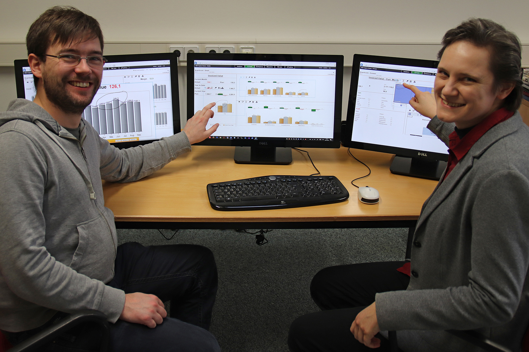 Ein besonderes Augenmerk legen die Wissenschaftlerinnen und Wissenschaftler auf eine gut verständliche und leicht zu bedienende Darstellung der Daten. Hierbei arbeiten sie unter anderem mit den Multi-Touchfunktionalitäten von Bildschirmen – so lassen sich durch die händische Steuerung auf dem Desktop Statistiken auswählen, verschieben, markieren, bearbeiten. „Die Interaktion läuft fast so wie mit einem Stift auf Papier. Es können auch mehrere Leute gleichzeitig auf den Bildschirmen arbeiten“, so Rubart zum gegenwärtigen Stand der Software. Für die Zukunft ist noch mehr Komfort geplant: In DROPS fließen Ergebnisse des parallel laufenden Projektes „Digitaler Boardroom 2.0“ ein, in dem ebenfalls das Fachgebiet Betriebliche Informationssysteme und die Next Vision GmbH kooperieren. Hier arbeiten sie an Lösungen für die Steuerung der Software über Gesten und Sprache.