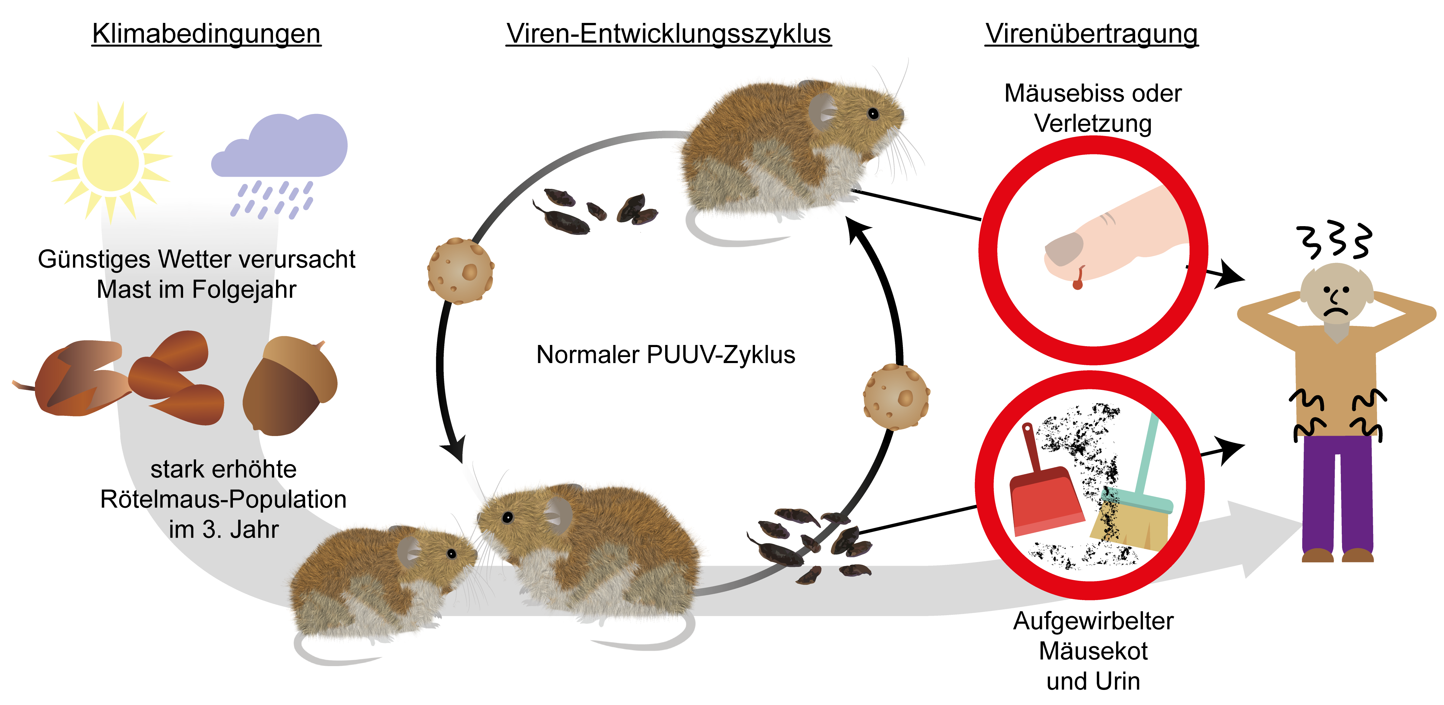 Aufgrund der komplexen Zusammenhänge und der Vielzahl an Faktoren, die Einfluss auf die Zahl der Puumala-Virus-Infektionen haben, ist es derzeit noch schwierig, ein zuverlässiges Vorhersage-Modell zu erstellen. Anhand von Korrelationsanalysen konnte die Gruppe aber ein höheres Risiko für waldreiche Gebiete ableiten sowie für den Frühsommer und für Jahre, die auf ein Mastjahr folgen. „Durch den Klimawandel, der häufigere Mastjahre und mildere Winter mit sich bringt, könnte die Zahl der Puumala-Virus-Infektionen künftig ansteigen“, prognostiziert Klimpel.
