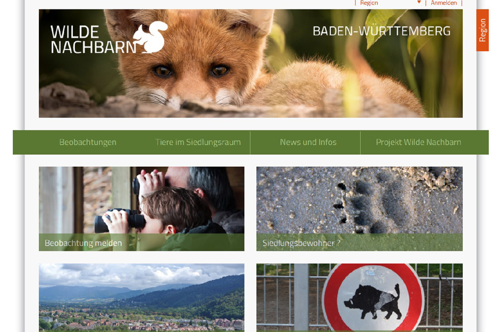 Wild animal have long known that human settlements provide an outstanding place to live, with a steady food supply, a milder climate, excellent cover, and few enemies. And so it happens that humans and animals often meet. If you are in Baden-Württemberg and you find a raccoon behind your garbage bins, have a hedgehog on your terrace at night, or meet up with a fox on your way home - you now have the opportunity to report your observation on the web portal www.bw.wildenachbarn.de. Wild animal sightings, tracks, fox dens and badger sets, as well as the location of dead animals, can be entered onto a map. If you are able to take a photo of what you observed, you can upload it and look at the images posted by other users.