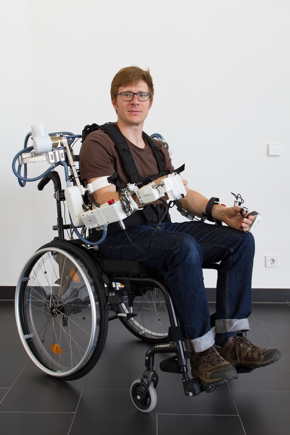 Für das robotische Teilsystem untersuchten die Forscherinnen und Forscher verschiedene Ansätze der rehabilitativen Therapie, die sie im Rahmen einer Anwenderstudie mit Schlaganfallpatienten evaluierten. Der Patient im Exoskelett oder eine dritte Person können das System betätigen und zwischen drei verschiedenen Steuerungsmodi wählen: Im ersten Modus lässt sich durch die Bewegung eines Armes, der andere mitbewegen – dieser führt dann exakt die gleiche Bewegung aus, wie der vom Patienten bewegte Arm. Auf diese Weise ist das Exoskelett für eine Spiegeltherapie einsetzbar, die nicht nur visuelle, sondern auch propriozeptive Stimulation – d.h. die Stimulation der eigenen Körperwahrnehmung – bietet. Der zweite Modus ermöglicht die Steuerung der Bewegung, die von einer dritten Person, z.B. dem Therapeuten, durch Führung eintrainiert wurde und so im Sinne einer repetitiven Therapie beliebig oft ausführbar ist. Im dritten Modus kann das Exoskelett auf Basis der Muskelaktivität des Patienten (die bei der Patientengruppe noch geringfügig vorhanden ist) gesteuert werden. Dies erfolgt durch die Messung der Elektromyografie-Signale (EMG-Signale), woraus das System die Bewegungsabsicht des Patienten ableiten und ihn in seinen Bewegungsabläufen intuitiv unterstützen kann.