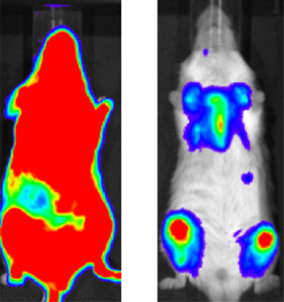 Bildunterschrift: Mäuse mit Leukämie: Eine Transplantation gesunder Immunzellen reicht nicht aus (links). Wird aber gleichzeitig Sorafenib gegeben, werden die Tumorzellen zurückgedrängt. (rot: viele Krebszellen, blau: wenige Zellen). Bioluminiszenz-Bildgebung.