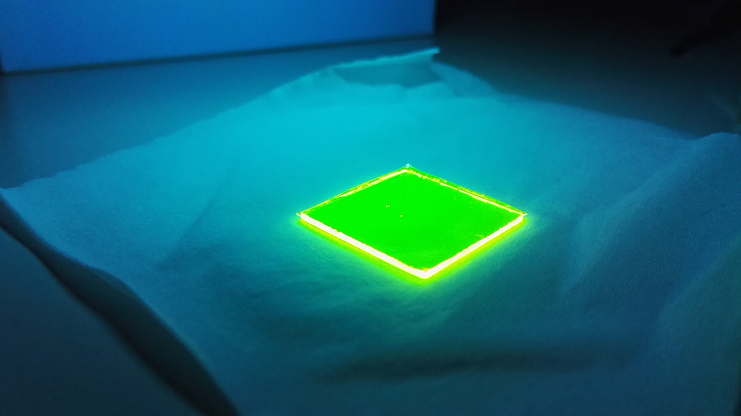 Das Foto "Leuchtende Folie nach Anregung mit blauem Licht" stammt von Alexander Pieper (nicht von Felix Pieper). Wir bitte um Entschuldigung.
