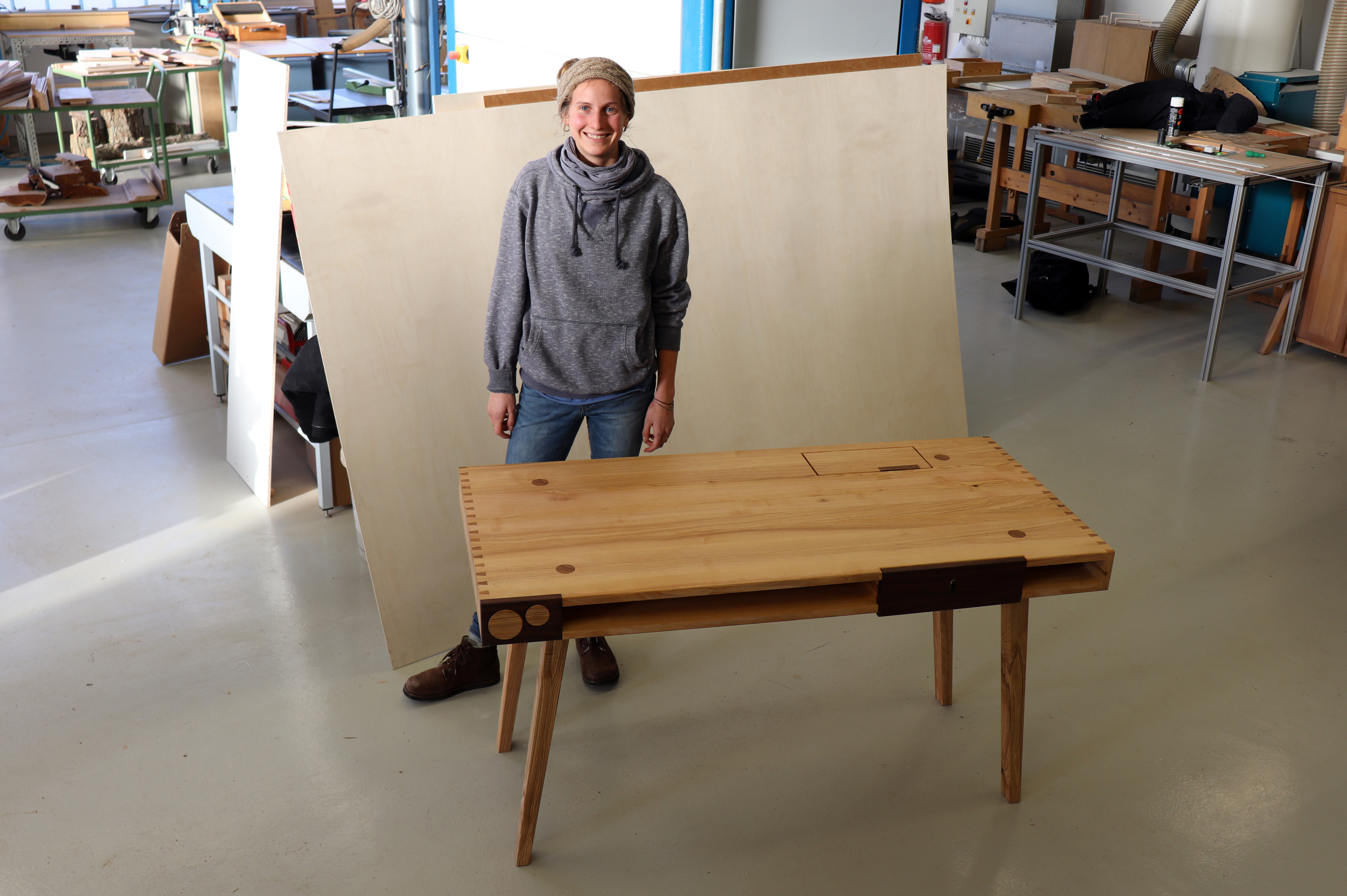 Dass sich Julia Schröder für einen Schreibtisch entschieden hatte, stand schon lange fest, da es in ihrer Eberswalder Wohnung noch an einem fehlte. „Er sollte praktisch sein und für Umzüge leicht zu transportieren“, nennt sie wichtige Kriterien. Als Hölzer verwendete sie Esche und amerikanischen Nussbaum, eine Kombination aus hellem und dunklem Massivholz, von deren Qualitäten sie überzeugt war. Im Ergebnis steht der Schreibtisch nun auf vier schmalen Beinen, hat eine großzügige Ablage und zwei raffiniert eingearbeitete, runde Schubladen an der einen Seite. „Ich hatte Lust auf etwas Rundes, diese kleinen Elemente konnte ich in dem vorgegebenen Zeitfenster gut realisieren“, blickt sie zufrieden auf ihr Gesellenstück.