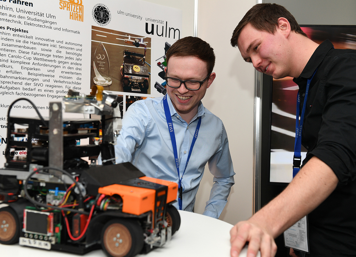 Fast schon auf dem Weg nach Braunschweig konnte sich das Team Spatzenhirn über einen weiteren Preis freuen: Beim Jahresauftakt der Carl Zeiss AG Anfang Februar in Aalen-Oberkochen wurden die Studierenden mit einem MINT-Award ausgezeichnet, den das Unternehmen im Rahmen seiner Initiative 2018 „Bildung Neu Denken“ erstmals ausgelobt hatte. Damit möchte Zeiss mehr junge Menschen für Naturwissenschaft und Technik begeistern und dem Fachkräftemangel entgegenwirken.