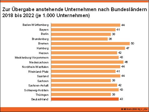 "Bezieht man die Anzahl der Unternehmen und die Unternehmensgrößenstruktur in die Betrachtung ein, so wird sich in den Stadtstaaten Bremen, Hamburg sowie in Niedersachsen am häufigsten die Frage nach der Unternehmensnachfolge stellen – in Brandenburg hingegen am seltensten", erklärt Dr. Rosemarie Kay, stellvertretende Geschäftsführerin des Instituts für Mittelstandsforschung (IfM) Bonn. Von den anstehenden Übergaben werden in Bremen mehr als 1.000 Beschäftigte je 1.000 Unternehmen betroffen sein, in Hamburg rund 845 Mitarbeiter und in Niedersachsen 755 Beschäftigte.