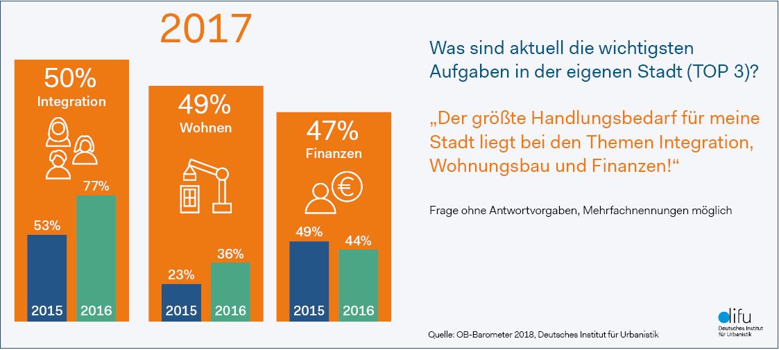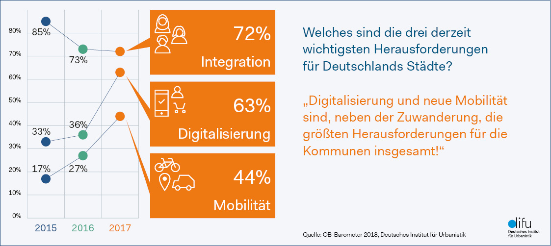 Stadtspitzen nennen bei aktueller Difu-Jahresumfrage „OB-Barometer 2018“ ihre wichtigsten Themen: Neben Integration/Zuwanderung und Kommunalfinanzen gewinnen Digitalisierung und Mobilität zunehmend an Dringlichkeit.