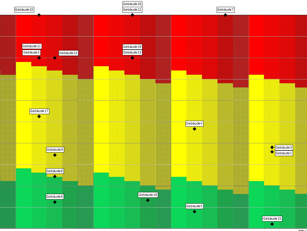 HIS-HE stellt Instrument zur Einordnung von Gebäuden in ein Ampeldiagramm zur Verfügung: In einem Gemeinschaftsprojekt von Hochschulen, einem Landesbaubetrieb und dem HIS-Institut für Hochschulentwicklung e. V. wurde ein Excel-Tool zur Beurteilung des Zustands von Gebäuden im Hochschulbereich entwickelt. Die Ergebnisse werden in einer Zustandsmatrix bzw. einem Ampeldiagramm/Risikographen übersichtlich dargestellt (siehe Abbildung).