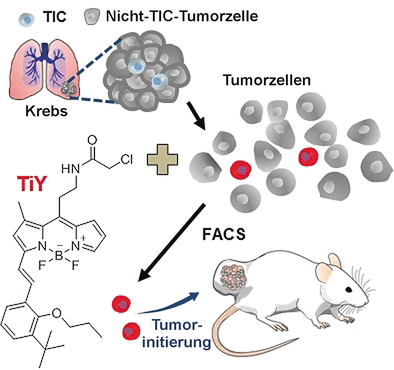 Dem Team von der Agency for Science Technology and Research (A*STAR), Singapur, der Pohang University of Science and Technology, Korea, sowie weiteren singapurischen und koreanischen Forschungseinrichtungen ist dies jetzt erstmals gelungen. Sie konnten nachweisen, dass ihre neue Sonde, ein Fluoreszenz-Farbstoff, TIC selektiv färbt, die aus so verschiedenen Krebsarten stammen, wie Tumoren der Lunge, des Zentralen Nervensystems, der Brust, der Niere, der Eierstöcke, des Darms, der Prostata, sowie Melanomen. Gesunde Zellen und „gewöhnliche“ Tumorzellen werden dagegen nicht markiert. In hoher Konzentration zeigt der Farbstoff sogar eine deutliche Cytotoxizität gegenüber TIC, während andere Zellen kaum beeinträchtigt werden.