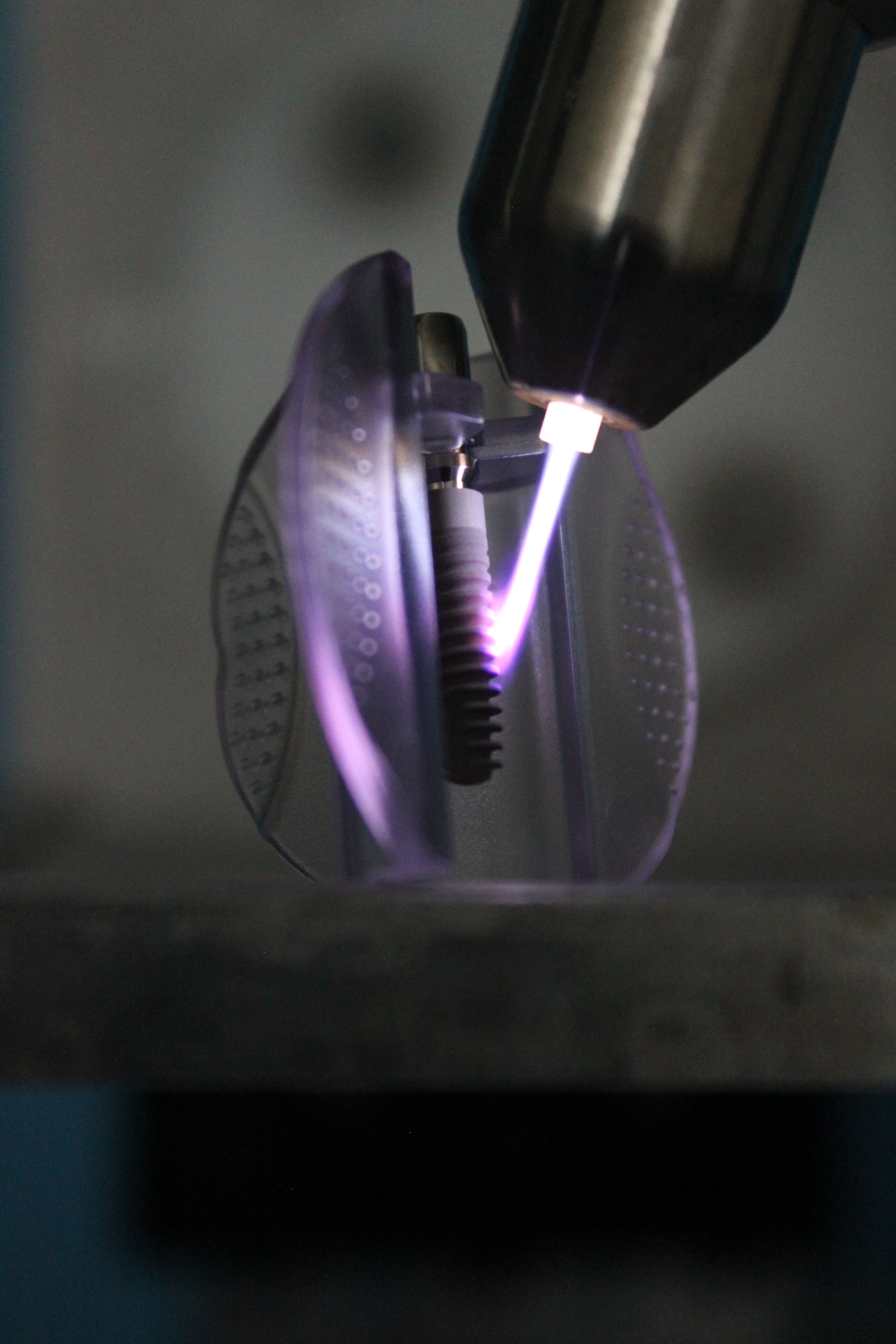 Bringt Plasma den Durchbruch - die beispielshafte Behandlung eines Implantats im Labor mittels Plasmajet kINPen (neoplas GmbH). Projektleiter Dr. Lukasz Jablonowski will das die nächsten drei Jahre untersuchen.