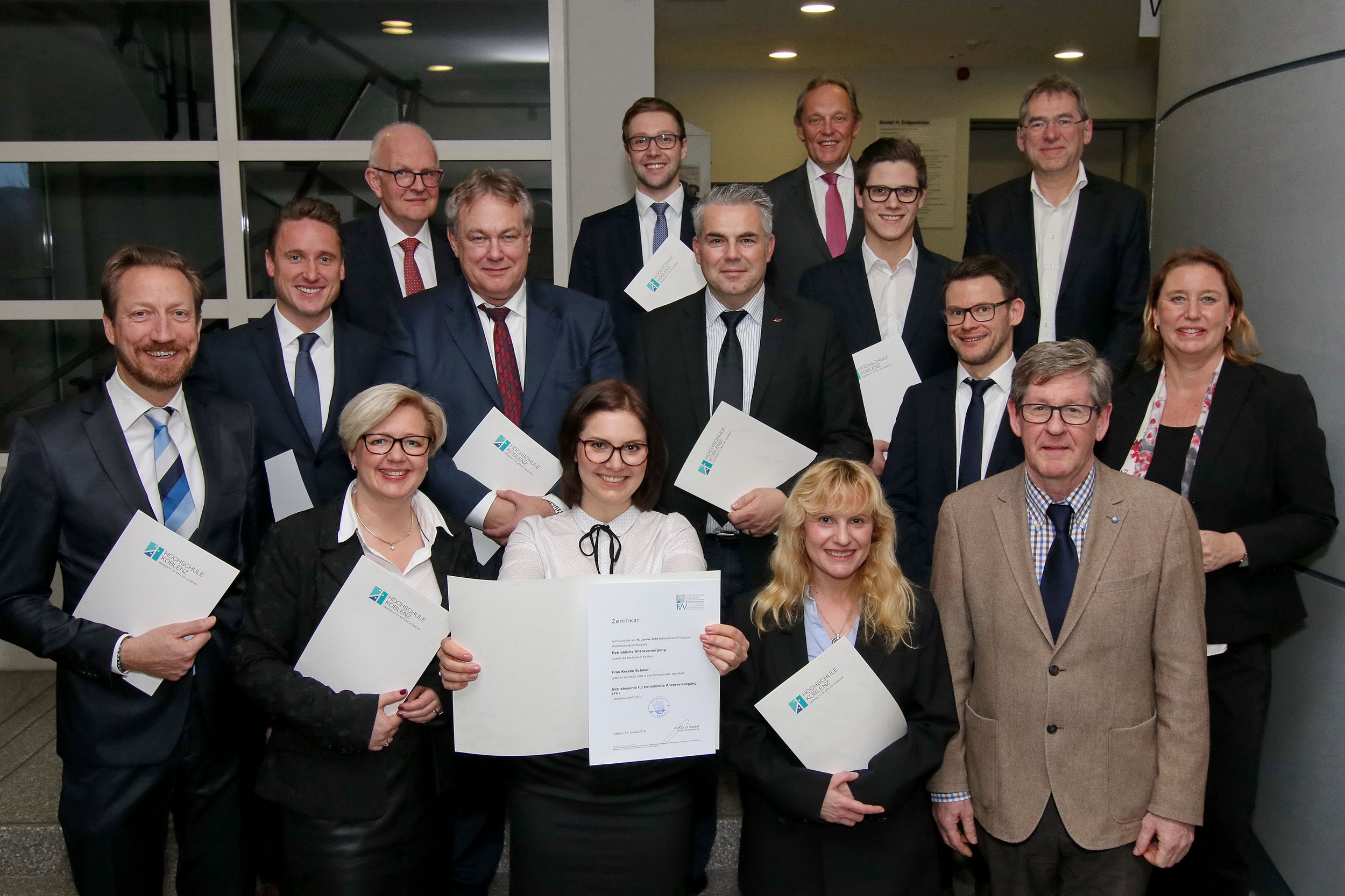 Foto: Absolventinnen und Absolventen des 27. Jahrgangs Betriebswirt/-in für betriebliche Altersversorgung (FH) an der Hochschule Koblenz. Im Bild rechts vorne Ulrike Hanisch, Vorstand des CAMPUS INSTITUT, und Prof. Dr. Günter J. Friesenhahn, Dekan des Fachbereichs Sozialwesen an der Hochschule Koblenz. Ganz hinten rechts befindet sich der Leiter des IFW, Prof. Dr. Martin Schmid.