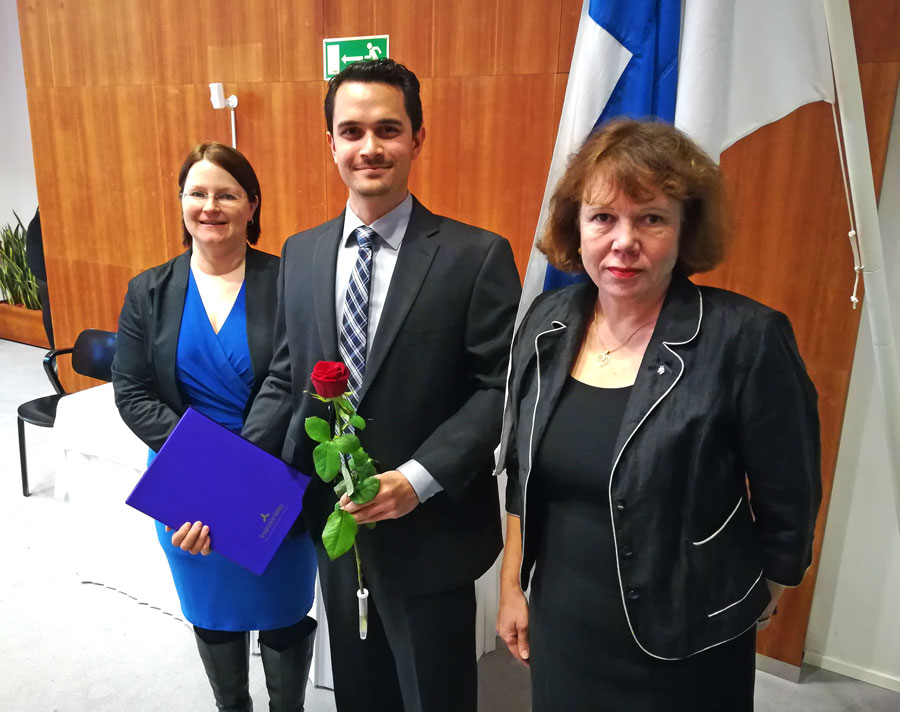 Bildunterzeile: Erster Absolvent mit Doppelabschluss an der Frankfurt UAS sowie der Metropolia UAS, v.l.n.r.: Vizepräsidentin Prof. Dr. Kira Kastell, Frankfurt UAS, Doppelabschluss-Absolvent Kai Kukasch, Präsidentin Riitta Konkola, Metropolia University of Applied Sciences.