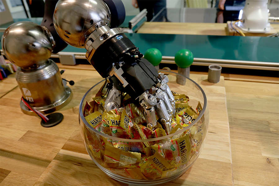 Einer der fünf Roboterarme des „Conveyor Bot 4.0“ und vier der fünf Greifer stammen von Schunk. Gemeinsam mit Robotern anderer Hersteller lösen sie aufeinander abgestimmt Kommissionier-Aufgaben. Der „Conveyor Bot 4.0“ zeigt dabei die Expertise des FZI, verschiedene Roboterkomponenten herstellerunabhängig mittels ROS-Industrial zu einer innovativen, flexiblen Logistik-Anwendung zu kombinieren, wie sie beispielsweise im E-Commerce immer stärker benötigt wird.