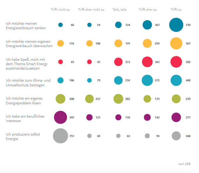 Auf Grundlage einer Online-Befragung von Energie-interessierten Menschen in Deutschland (N= 1.651), fand die Studie heraus, dass 29 Prozent der StudienteilnehmerInnen bereits Smart Energy Produkte oder Lösungen nutzen. Mit diesen digitalen Lösungen setzen sich NutzerInnen vor allem auseinander, um den eigenen Energieverbrauch zu senken und zu überwachen. Weiterhin spielen berufliches Interesse oder der Spaß und die Begeisterung, sich mit einem energietechnischen Problem zu beschäftigen eine wichtige Rolle.