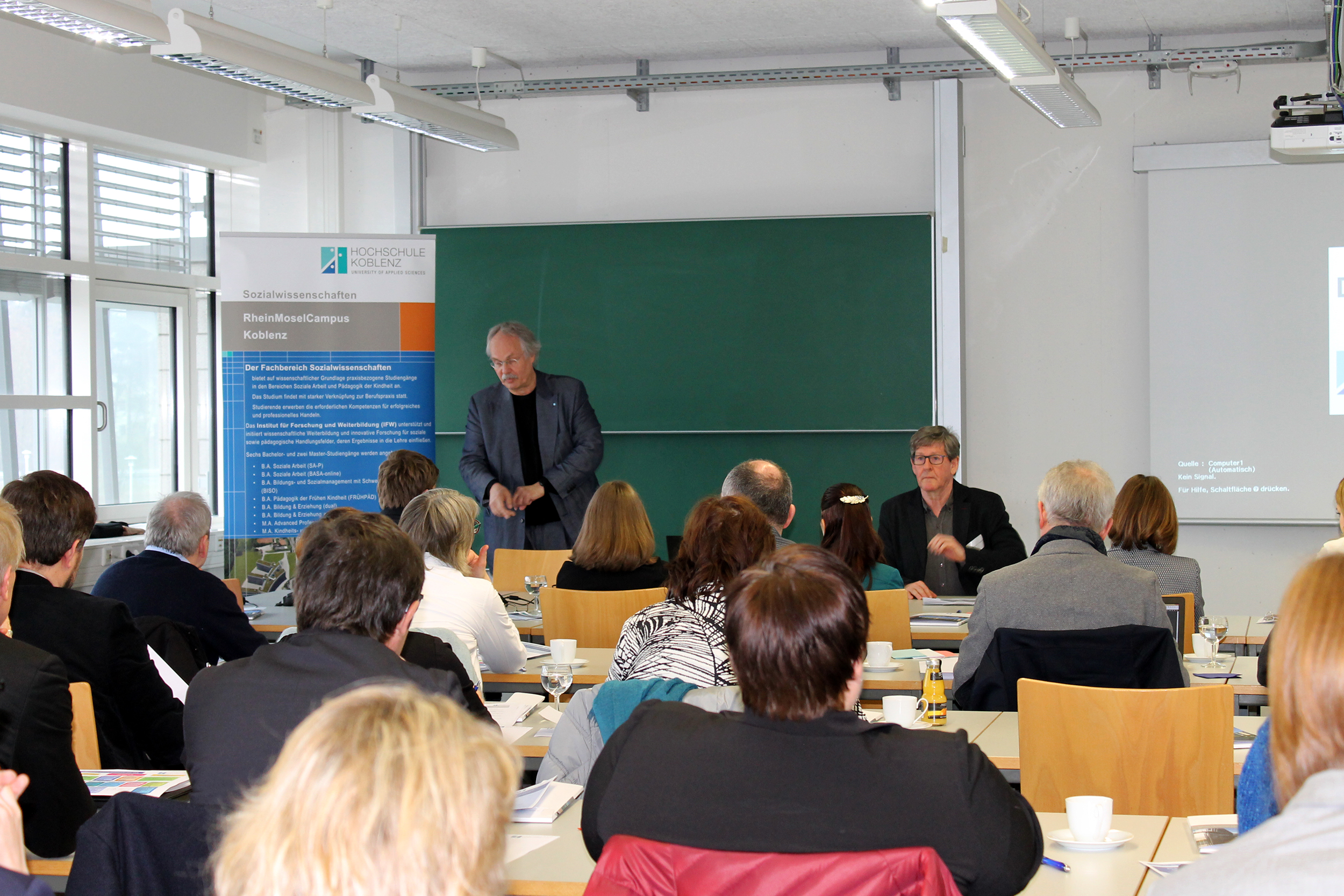 Das Team des Fachbereichs Sozialwissenschaften hat in den letzten Jahren seine Studienformate kontinuierlich weiterentwickelt und dabei auch immer wieder neue didaktische und die Curricula betreffende Akzente gesetzt, die weit über Koblenz hinaus Beachtung finden. Dies führte jetzt zu einer Tagung „Berufsintegriert, berufsbegleitend, dual und online – Einblicke in Struktur, Formate und Inhalte der Studiengänge des Fachbereichs Sozialwissenschaften“ am RheinMoselCampus, zu der Prof. Dr. Kristian Bosselmann-Cyran, Präsident der Hochschule Koblenz, und der Dekan des Fachbereichs Sozialwissenschaften, Prof. Dr. Günter J. Friesenhahn, begrüßen konnten. Der Fokus der Kurzreferate, die von den Kolleginnen und Kollegen und Mitarbeiterinnen und Mitarbeitern des Fachbereichs präsentiert wurden, lag darauf, spezifische inhaltliche und methodische Elemente der Studiengänge herauszustellen und die didaktischen Herausforderungen für Studierende und Lehrende zu beschreiben, die mit Online-Lehre verbunden sind.