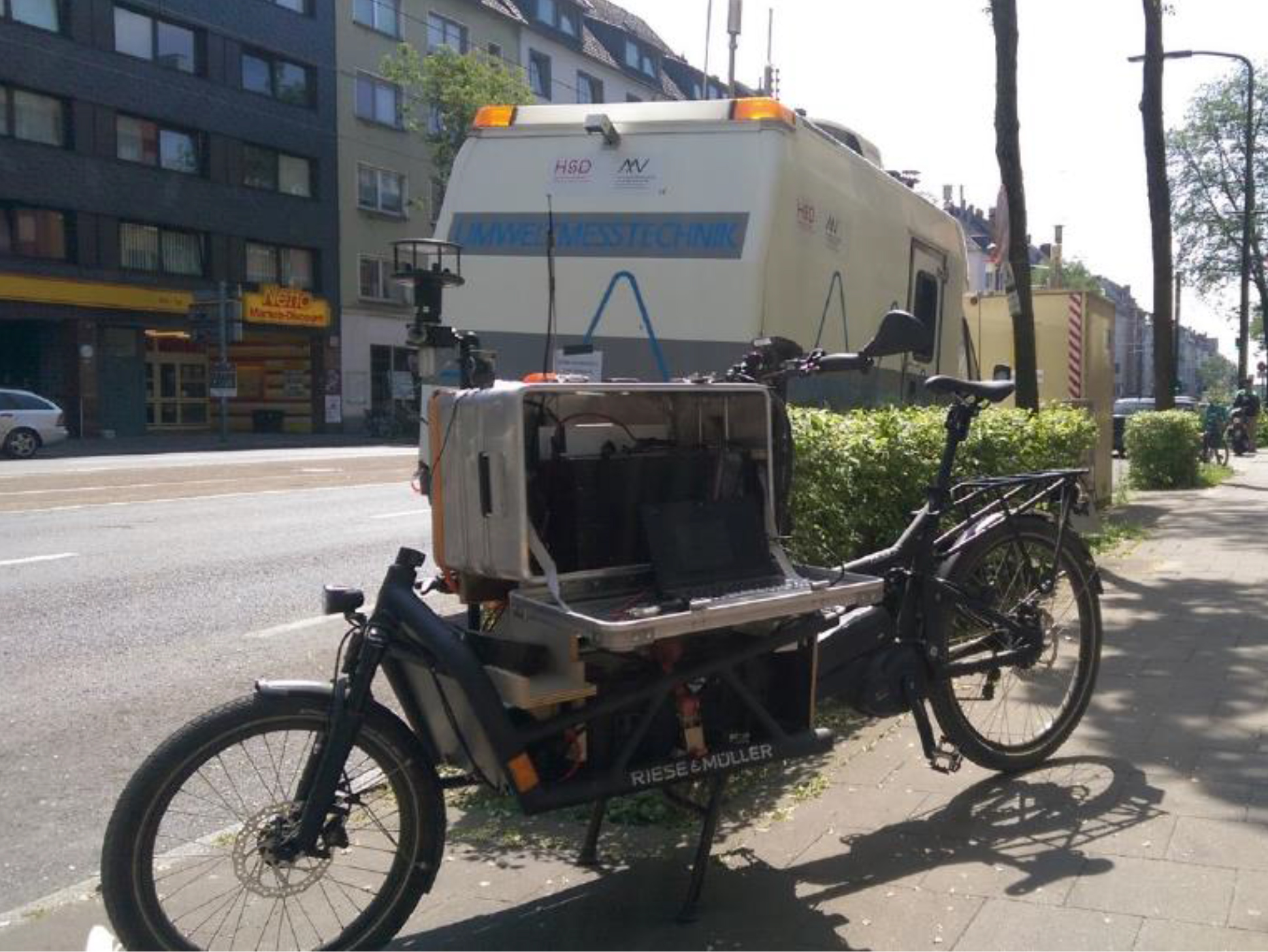 Die stationären Messungen wurden dabei um systematische Messfahrten durch ein innovativ instrumentiertes Messfahrrad ergänzt, mit dem ausgehend von der Corneliusstraße spiralförmig Messfahrten in den angrenzenden Stadtgebieten bis hin zum Volksgarten durchgeführt wurden. Die Untersuchungen werden derzeit mit dem Messwagen des Labors für Umweltmesstechnik fortgeführt. Die bisherigen Ergebnisse zeigen, dass die Corneliusstraße ein tatsächlich mit NO2 deutlich belasteter Standort ist. Darüber hinaus konnte gezeigt werden, dass auch die Konzentrationen von Ultrafeinstaub und Ruß signifikant mit dem Verkehr korrelieren. Ein Teil der Ergebnisse wurde jetzt beim 2. Symposium zu ultrafeinen Partikeln, das von der Technischen Universität Berlin und dem Umweltbundesamt veranstaltet wurde, vorgestellt.