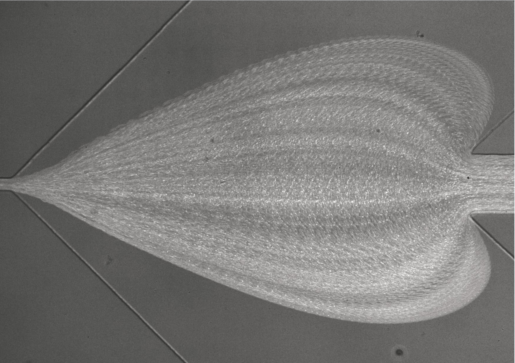 Bildunterschrift: Schnelle Diagnose von Krankheiten mit RT-DC in Aktion. Die künstlerische Darstellung des mikroskopischen Blicks in den Messchip zeigt die Flußbahnen vieler einzelner Blutkörperchen, die von rechts nach links fließen. Wo der Hüllstrom von oben und unten einfliesst, verbreitern sie sich zu einem "Herz", bevor sie in den schmalen Messkanal links eindringen, wo das Erscheinungsbild und die Deformation der Zellen analysiert werden.