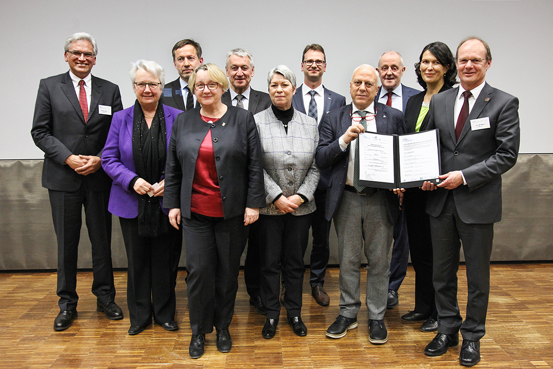 Protagnonisten der DZNE-Eröffnung (v. l.): Oberbürgermeister Gunter Czisch, Annette Schavan (Botschafterin beim Heiligen Stuhl), Prof. Udo X. Kaisers (Leitender Ärztlicher Direktor Universitätsklinik Ulm), Theresia Bauer (Ministerin für Wissenschaft, Forschung und Kunst Baden-Württemberg), Dekan Prof. Thomas Wirth (Medizinische Fakultät), Bärbel Brumme-Bothe (Bundesministerium für Bildung und Forschung), Matthias Gruber (Geschäftsführer RKU), Prof. Pierluigi Nicotera (Wissenschaftlicher Vorstand DZNE), Ärztlicher Direktor Prof. Albert Ludolph (Standortsprecher DZNE Ulm), Dr. Sabine Helling-Moegen (Administrativer Vorstand DZNE) und Universitätspräsident Prof. Michael Weber (Foto: Carola Gietzen)