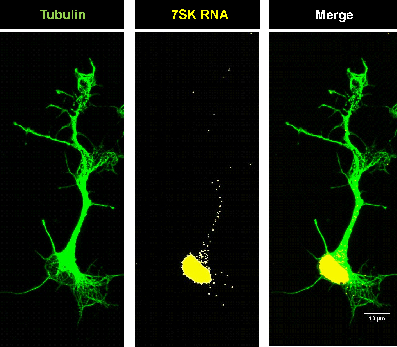 Die Forscher haben dafür neue Zellkultursysteme entwickelt, mit denen es möglich ist, die Funktion solcher mRNA-Partikel für den Transport von mRNAs ins Axon zu untersuchen. Damit konnten sie zeigen, dass 7SK zusammen mit dem RNA-bindenden Protein hnRNP R an Transportkomplexen für funktionell wichtige mRNAs beteiligt ist. Fehlt einer der beiden Partner, werden diese Transportkomplexe gestört mit den bereits beschriebenen Folgen: ein verminderter Transport der assoziierten mRNAs und dadurch ein reduziertes Axonwachstum.