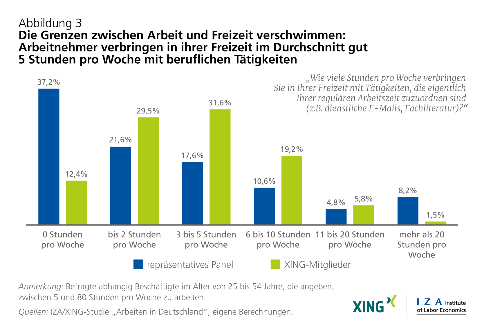 In der IZA/XING-Studie geben vier von zehn Arbeitnehmern (41,2%) an, in ihrer Freizeit mehr als zwei Stunden pro Woche mit Tätigkeiten zu verbringen, die eigentlich ihrer regulären Arbeitszeit zuzuordnen sind (z.B. Lesen und Beantworten von dienstlichen E-Mails, Beschäftigung mit Informationsmaterial und Fachliteratur). Bei den XING-Mitgliedern sind es deutlich mehr als die Hälfte (58,1%). Der durchschnittliche Arbeitnehmer verbringt auf diese Weise gut fünf Stunden seiner wöchentlichen Freizeit mit beruflichen Tätigkeiten. Mehr als sechs Stunden pro Woche beschäftigen sich Arbeitnehmer in der Freizeit zumindest gedanklich mit Vorgängen, die mit ihrer Arbeit zusammenhängen.