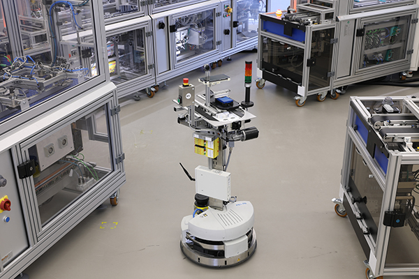 Die SmartFactoryKL hat gemeinsam mit ihren Partnern am flexiblen Transportsystem (FTS) eine optische Qualitätskontrolle eingesetzt. Im Sinne des Retrofittings wurde das FTS mit einer Kamera ausgestattet. Während das Produkt, der Visitenkartenhalter, von einer Fertigungslinie zur nächsten gefahren wird, können nun die Produktqualität geprüft und somit die Totzeit des Logistikprozesses sinnvoll genutzt werden. Das Bild wird über die 5G-Technologie in die Cloud übertragen, wo es mit Hilfe einer Software ausgewertet wird. Das Ergebnis der Qualitätskontrolle wird an das Transportsystem übermittelt und die Navigation des FTS entsprechend geregelt: Ist alles in Ordnung, gelangt das Produkt an die nächste Fertigungslinie zur automatisierten Verarbeitung. Liegt hingegen ein Fehler vor, kann das Produkt an den Handarbeitsplatz zur manuellen Nachbearbeitung gefahren werden. Im Produktionsalltag kann durch ein solches Vorgehen frühzeitig Ausschuss im Prozess erkannt und der kostenintensive Einsatz von Fertigungsressourcen an Schlechtteilen verhindert werden. Die Produktionseffizienz steigt.