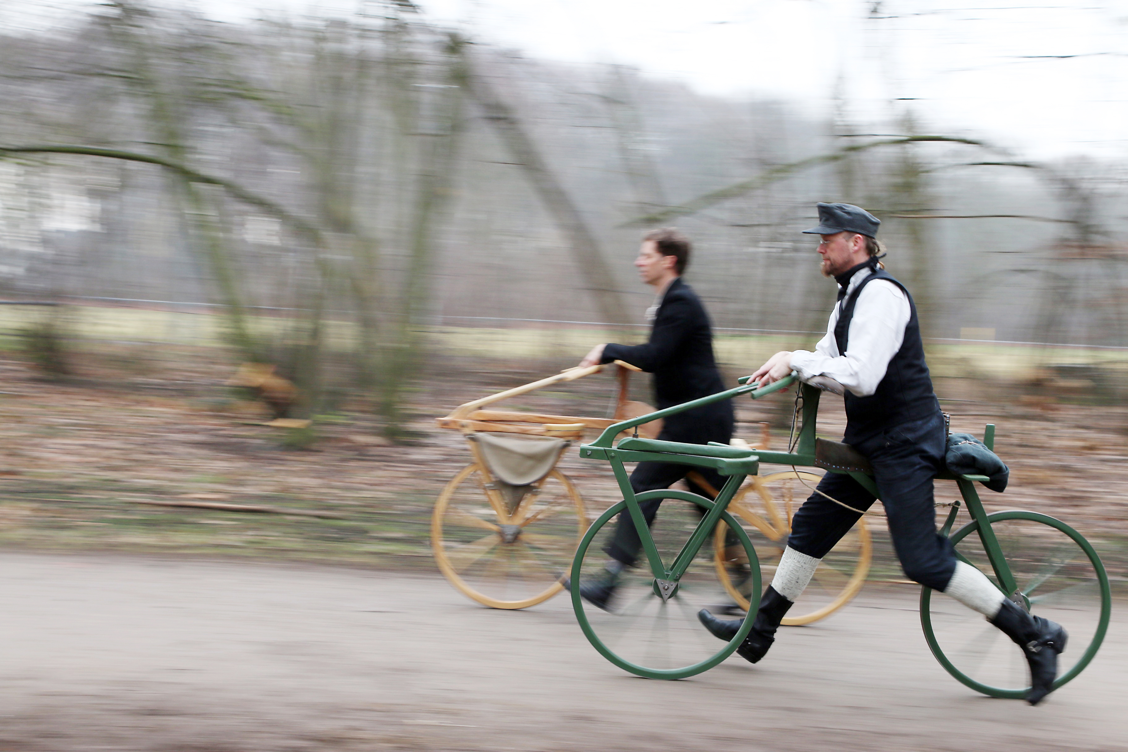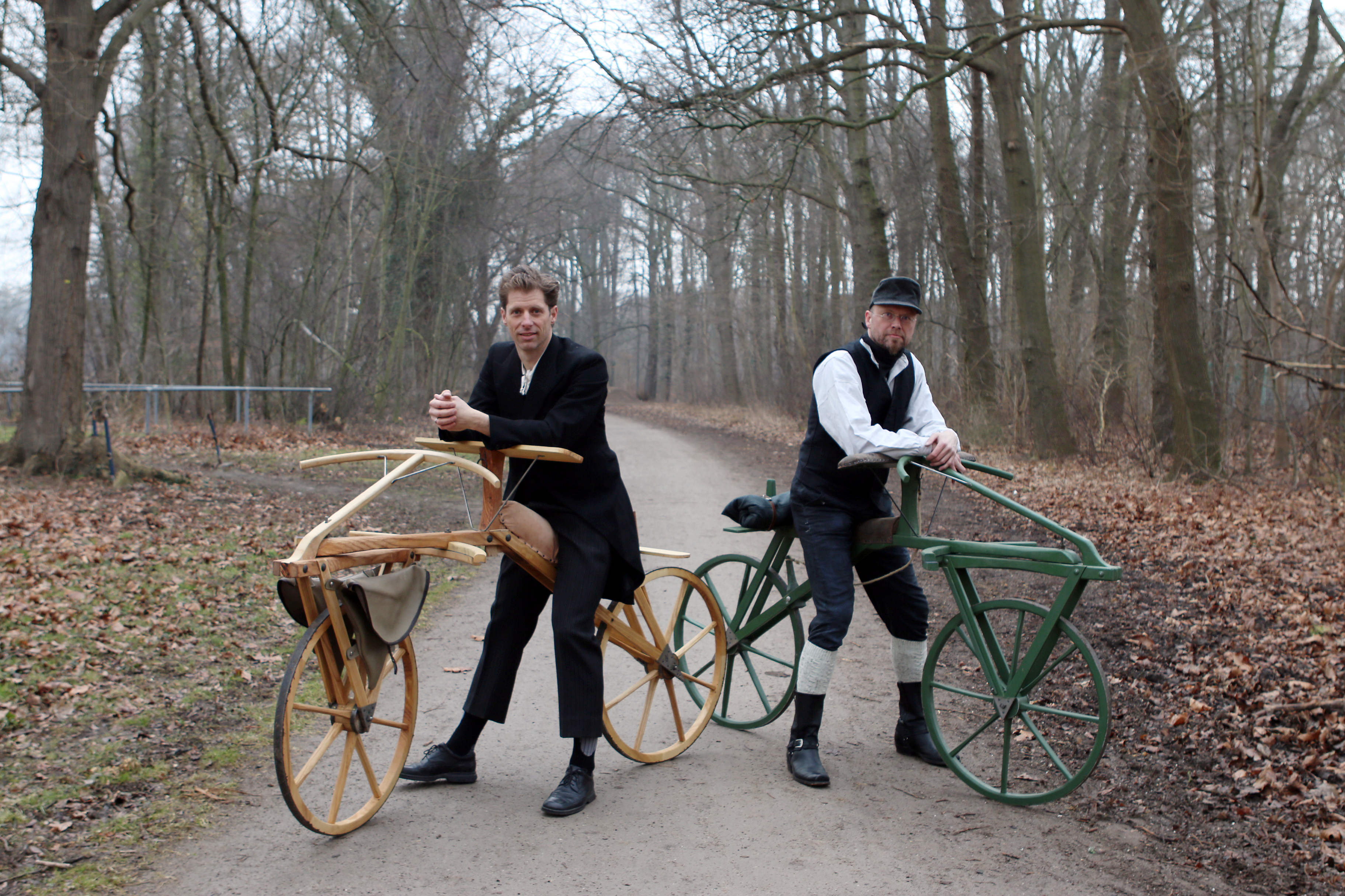 Die Laufmaschinen von Frank Hülsemann (46) und Achim Schmidt (48) wurden nach Originalvorlagen in zwölfmonatiger Eigenarbeit, mit Unterstützung von Handwerkern sowie von Mitarbeitern des Instituts für Biomechanik der Deutschen Sporthochschule, nach Beratung durch das Technoseum Mannheim angefertigt.