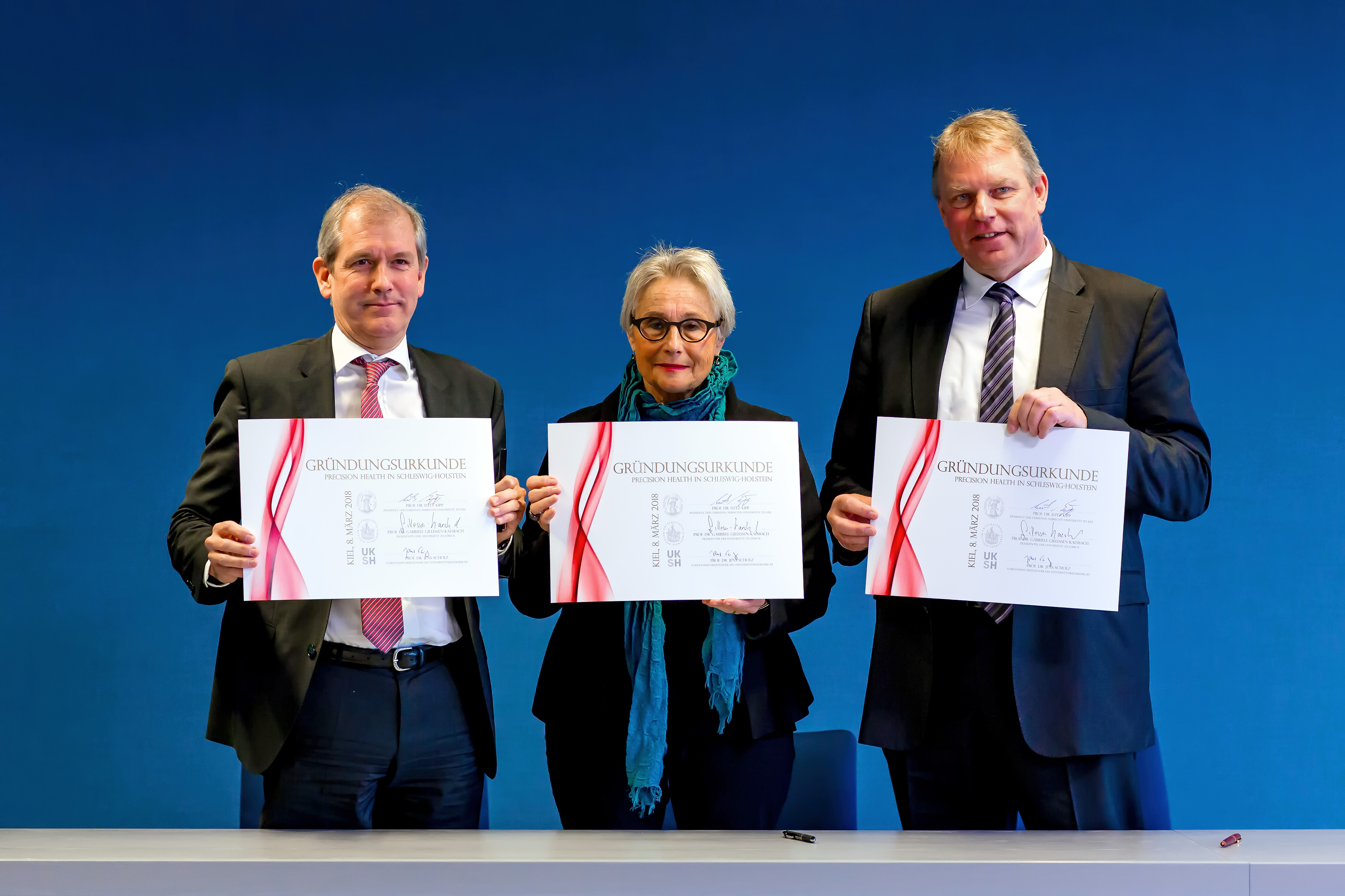 Heute (Donnerstag, 8. März) unterzeichneten der Präsident der CAU, Professor Lutz Kipp, die Präsidentin der UzL, Professorin Gabriele Gillessen-Kaesbach, sowie der Vorstandsvorsitzende des Universitätsklinikums Schleswig-Holstein, Professor Jens Scholz, die Gründungsurkunde in Kiel.