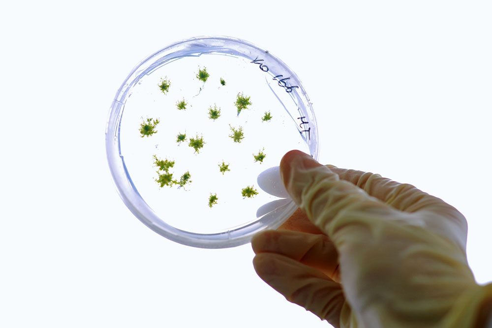 Moospflanzen auf einer Petrischale.