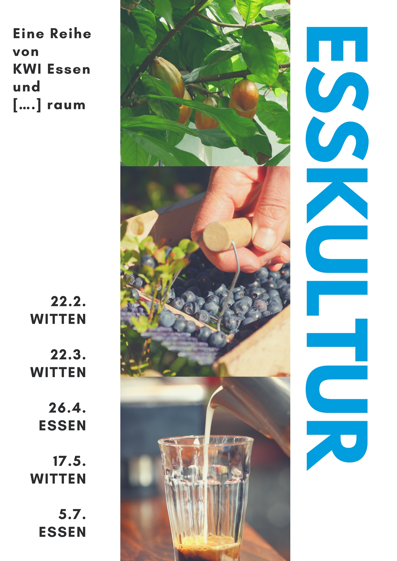 Die Reihe „Esskultur – Perspektiven auf Geschmack und Ernährung in einer globalisierten Welt“ ist eine Kooperation zwischen [….] raum e.V. und dem Kulturwissenschaftlichen Institut Essen (KWI). Im Mittelpunkt steht der Geschmack. Er wird an fünf Abenden in praktischen Übungen, also vom eigenen Erleben ausgehend erkundet und durch theoretische Auseinandersetzungen in größere gesellschaftliche Zusammenhänge gesetzt. Die Veranstaltungsreihe zeichnet einen Verlauf vom individuellen Geschmacksempfinden und Erproben der Geschmackssinne über gesellschaftliche und kulturelle Aspekte des Geschmacks, bis hin zu wirtschaftlichen, sozialen und globalen Zusammenhängen der Ernährung.