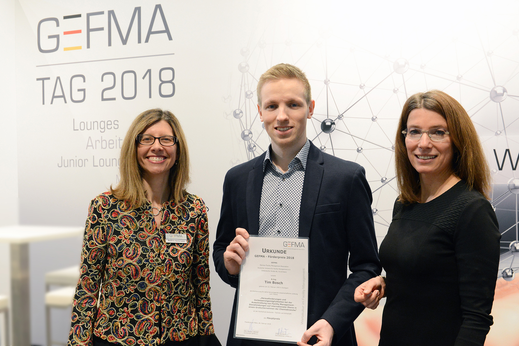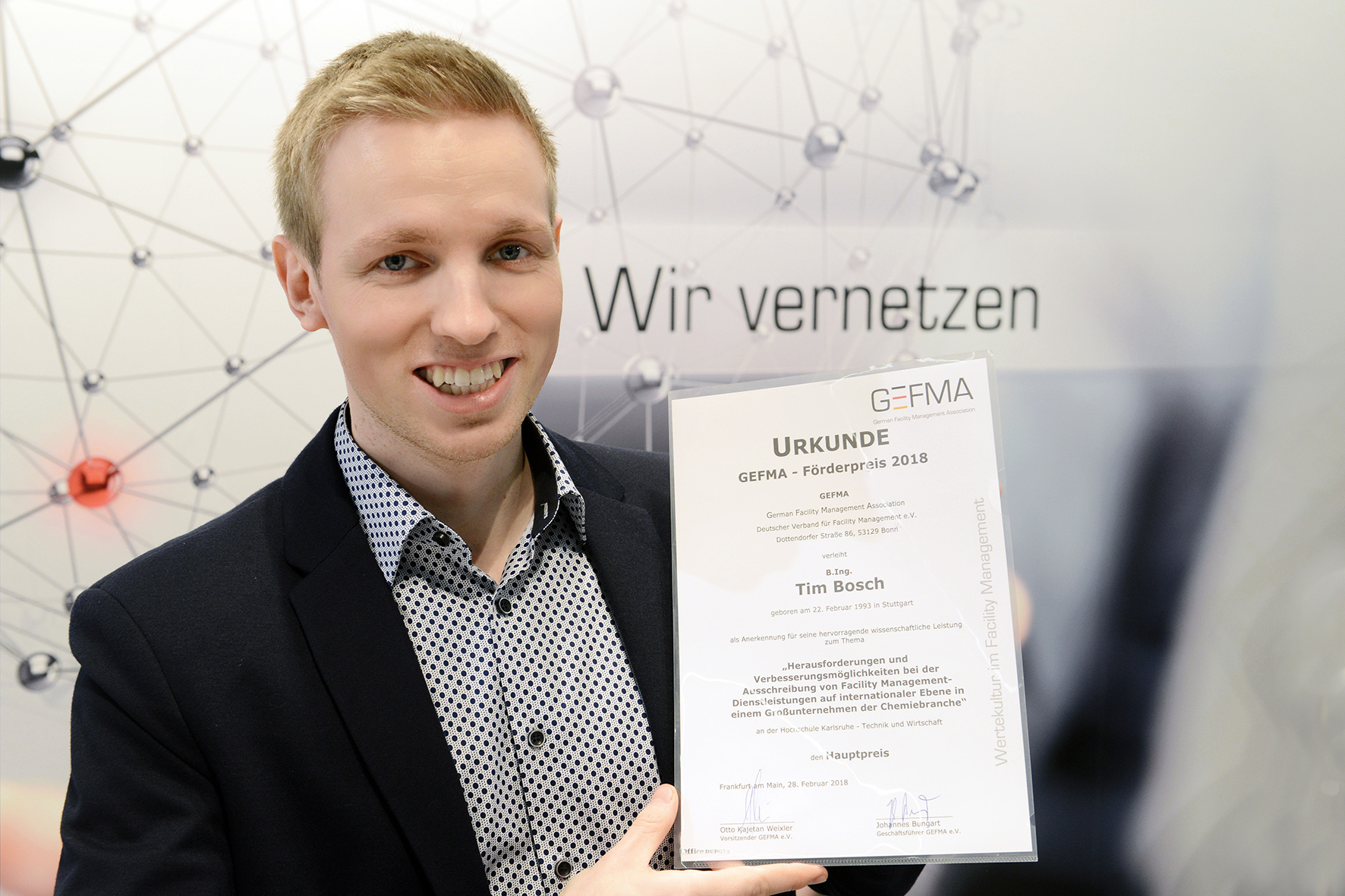 Beim Wettbewerb der besten akademischen Arbeiten im Facility Management wurde Tim Bosch, Absolvent im Masterstudiengang Baumanagement an der Hochschule Karlsruhe – Technik und Wirtschaft, mit dem Hauptpreis des Deutschen Verbands für Facility Management e. V. GEFMA (German Facility Management Association) ausgezeichnet. Das Preisgeld beträgt 3 000 Euro. Der Verband schreibt einmal jährlich den GEFMA-Förderpreis bundesweit aus, um den sich Absolventen von Facility Management und verwandten Studiengängen mit ihren Bachelor- und Masterarbeiten oder Dissertationen zum Thema Facility bewerben können. Bei der Ausschreibung 2018 wurden 18 Arbeiten von der Jury bewertet und sechs Preisträger gekürt.