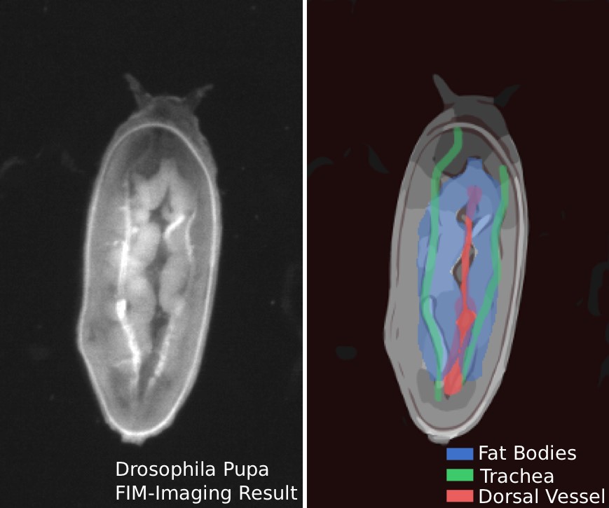 The researchers systematically pursued their work on visualizing the heartbeat – using fly pupae, which are motionless and thus more suitable for studying the pulse. They developed algorithms which automatically recognize and quantify the pulsating movement of a fly’s heart in the video images. For observation purposes the researchers lay the animals belly-up on the FIM table when they are at an early stage of development, as so-called pre-pupae.