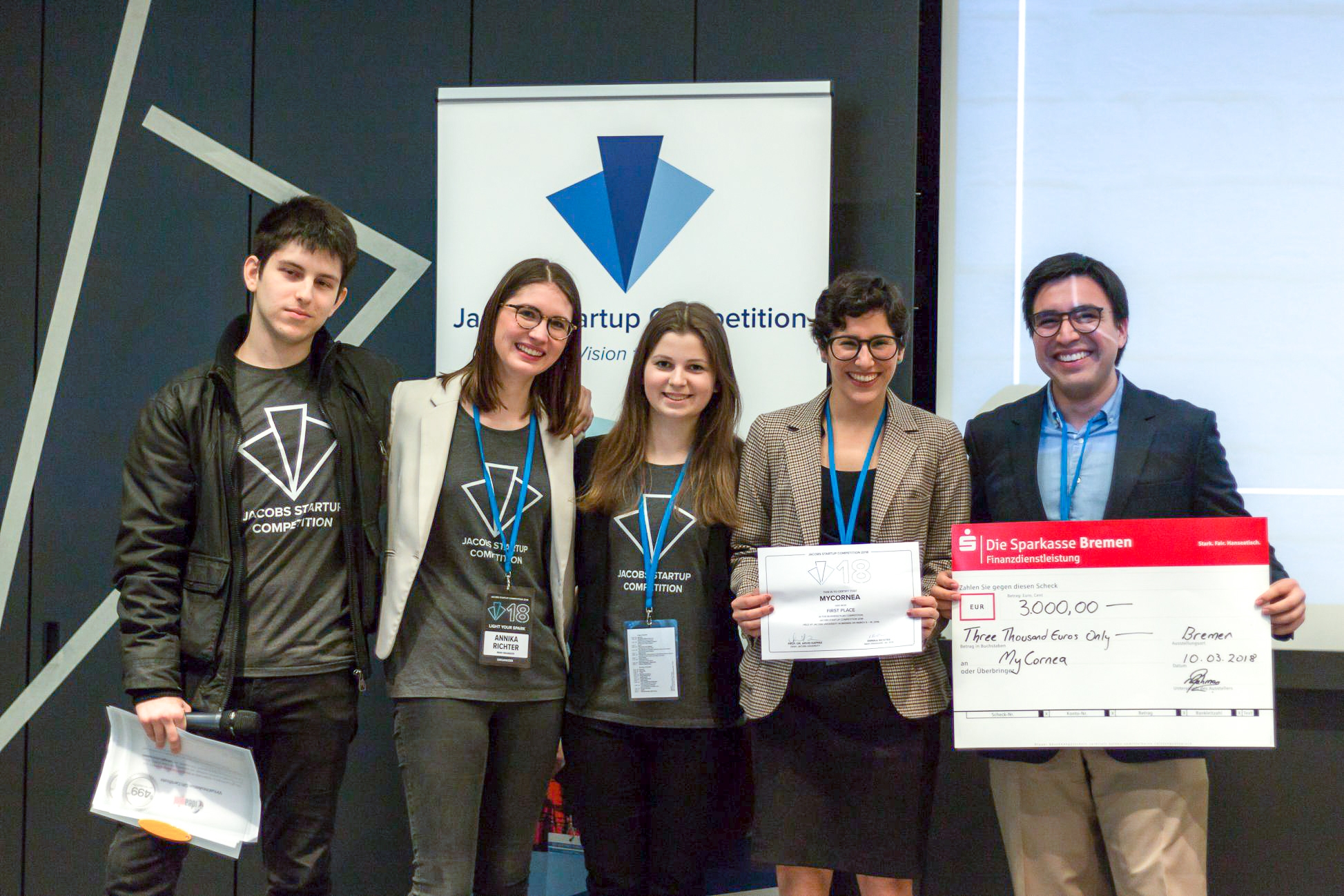 It is not unusual for millions of people throughout the world to wait one to two years for a cornea transplant. The “MyCornea” start-up wants to reduce this waiting period to six weeks. The University of Cambridge students behind the startup developed a process for manufacturing artificial corneas. The transplants are customized to the specific eye. This concept also convinced the jury of Jacobs University’s Startup Competition. MyCornea was able to take the winner’s check for 3,000 euros back home to England.