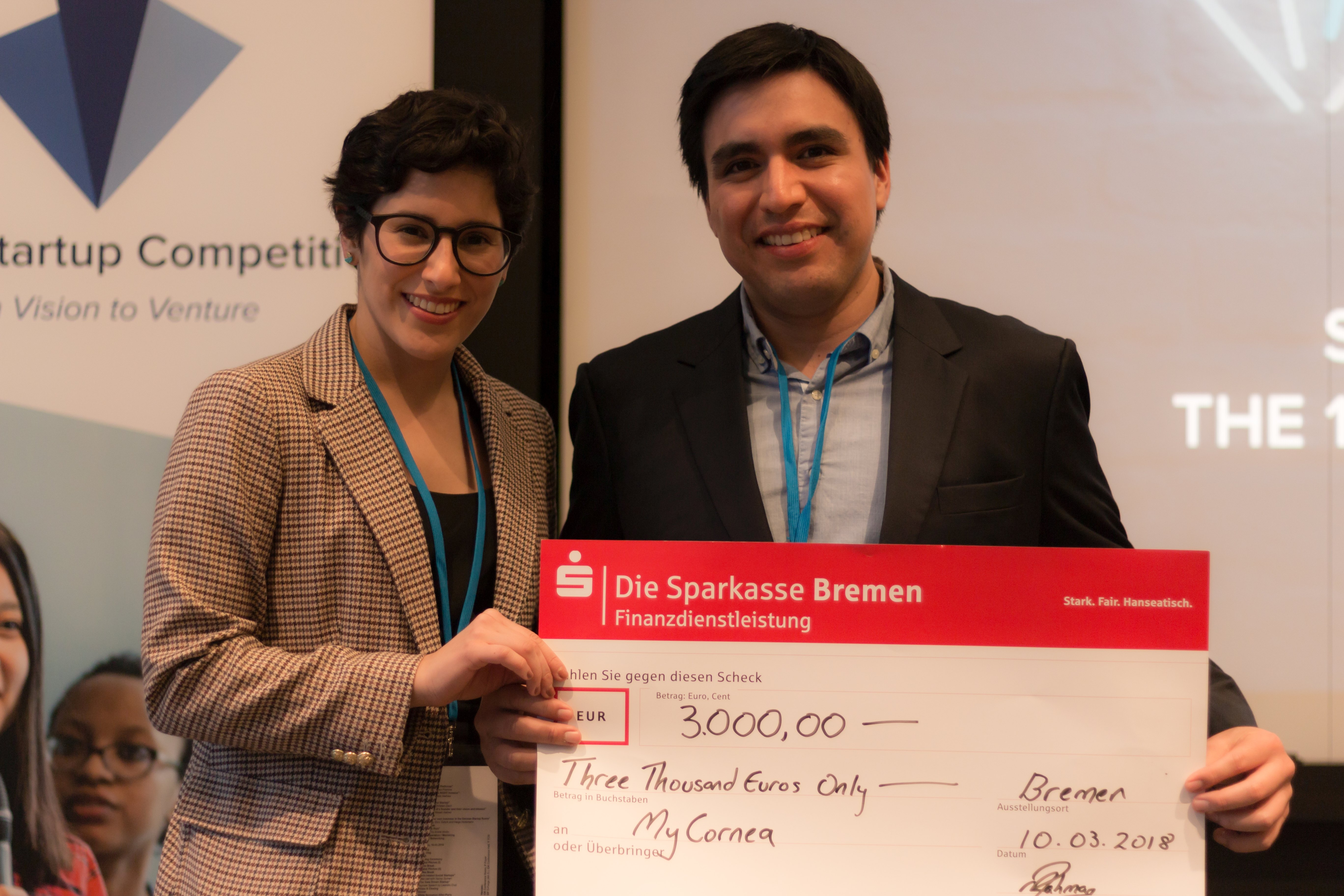 Weltweit warten Millionen Menschen auf eine Hornhauttransplantation, nicht selten ein bis zwei Jahre. Das Startup „MyCornea“ will diese Wartezeit auf sechs Wochen verringern. Die Studierenden der Universität Cambridge, die hinter dem Startup stecken, haben ein Verfahren zur Herstellung künstlicher Hornhaut für Augen entwickelt. Die Transplantate werden individuell für das Auge gefertigt. Dieses Konzept überzeugte auch die Jury der Startup Competition der Jacobs University. MyCornea durfte den Siegerscheck über 3000 Euro mit nach England nehmen.