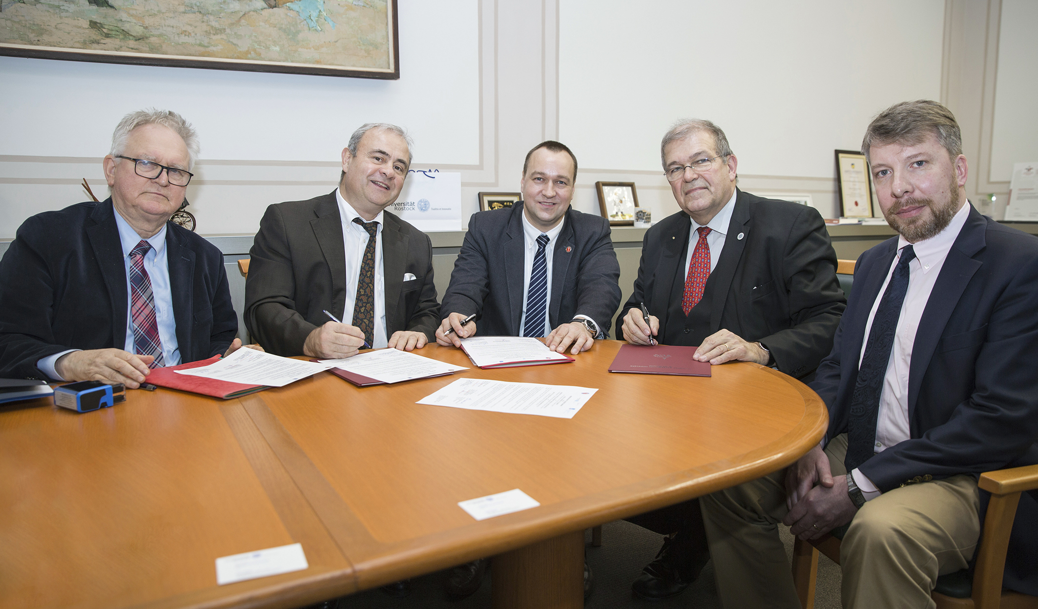 v. l. Professor Klaus-Peter Schmitz (Institut für ImplantatTechnologie und Biomaterialien e.V. ), Professor Emil C. Reisinger (Dekan der Medizinischen Fakultät, Universität Rostock), Professor Tomasz Bączek (Prorektor für Wissenschaft, Medizinische Universität Danzig), Rektor Professor Wolfgang Schareck und PD Dr.-Ing. Niels Grabow (Institut für Biomedizinische Technik, Universitätsmedizin Rostock) bei der Unterzeichnung des „Memorandum of Understanding“.