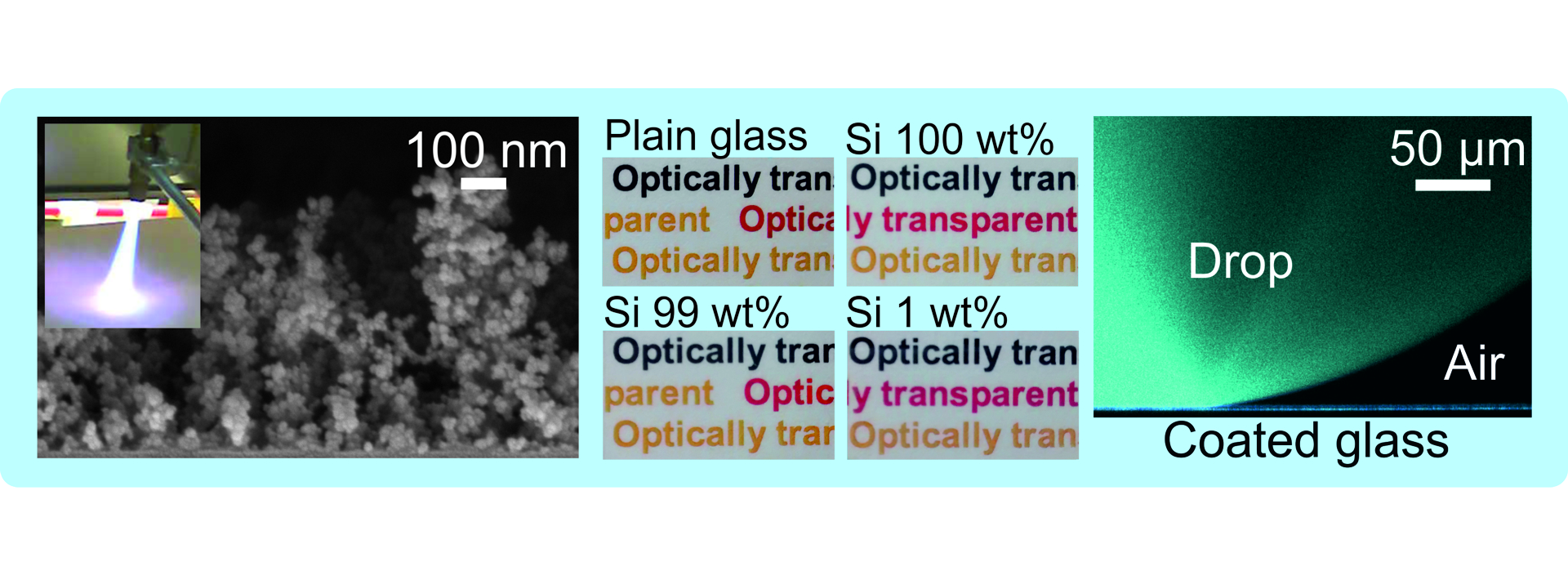 Durch den Einsatz von flüssigem Flammenspray ist diese Methode extrem schnell. Nicht nur Wasser, sondern auch Öltropfen haften dadurch nicht mehr an entsprechend behandelten Oberflächen, sondern bleiben sphärisch und hüpfen oder rollen leicht ab.
