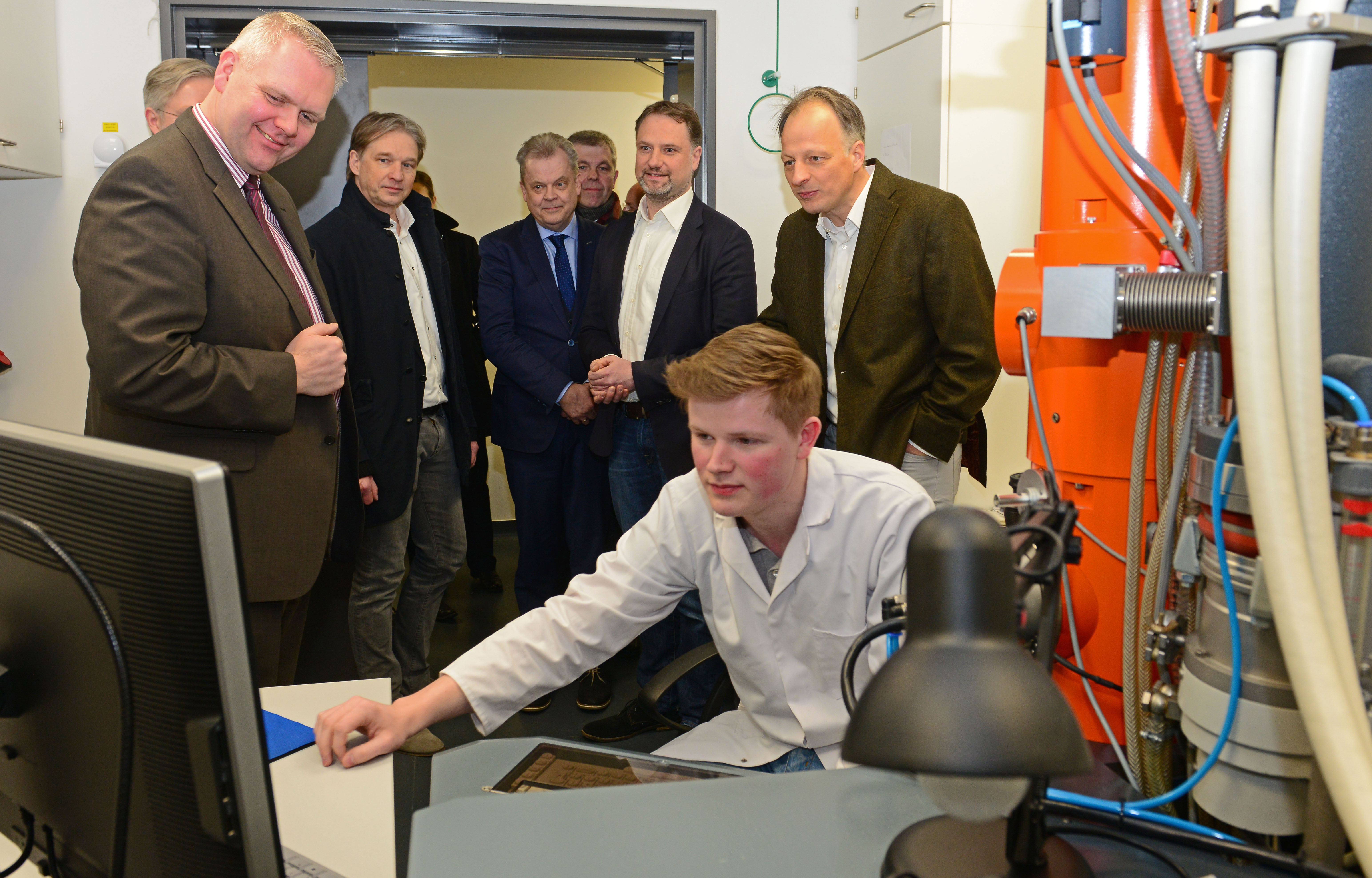 Im Rahmen ihres Besuchs an der Universität Osnabrück besichtigte Minister Thümler das bundesweit einmalige Center of Cellular Nanoanalytics (CellNanOs). Wissenschaftler aus über 30 Arbeitsgruppen der Naturwissenschaften und Mathematik forschen dort mithilfe modernster Technik an der Schnittstelle von Zellbiologie und Nanowissenschaft.