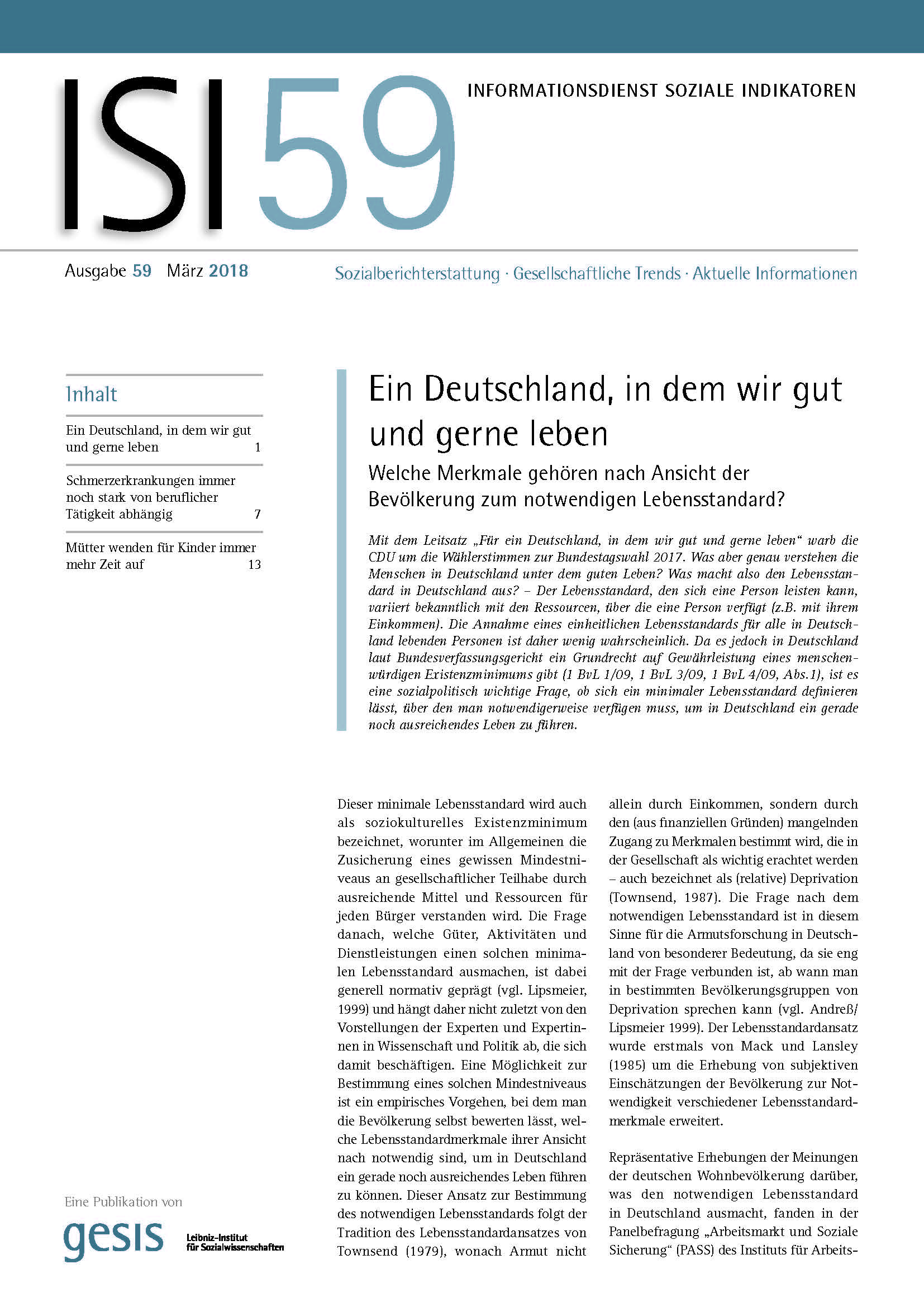 In Deutschland ist die Gewährleistung eines menschenwürdigen Existenzminimums durch das Bundesverfassungsgericht als Grundrecht festgeschrieben. Was zu diesem minimalen Lebensstandard, der auch als soziokulturelles Existenzminimum bezeichnet wird, dazugehört, ist normativ geprägt. Zur Identifikation entsprechender Erwartungen in der Bevölkerung wurden in der Panelbefragung „Arbeitsmarkt und Soziale Sicherung“ (PASS) von 2006/07 sowie in der 17. und 19. Welle des GESIS Panels von 2016 nach den Einstellungen der deutschen Bevölkerung zum soziokulturellen Existenzminimum gefragt. Ergebnisse auf Basis dieser Befragungen wurden aktuell im Informationsdienst Soziale Indikatoren ISI 59 publiziert.