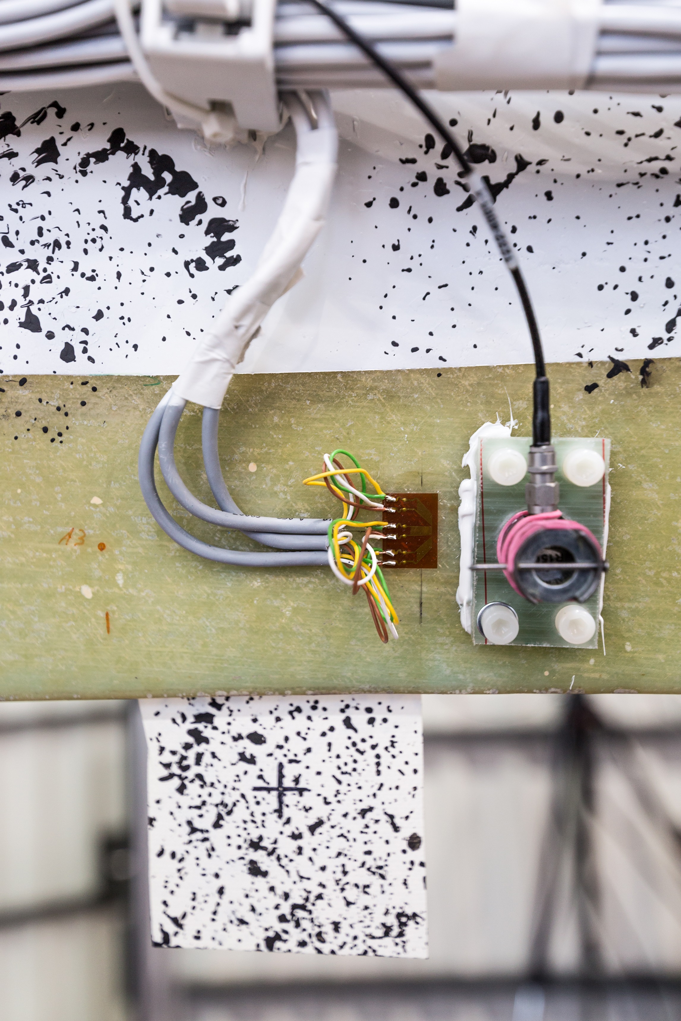 Four cameras follow the course of testing and record the surface of the test object, which has been prepared with a speckle pattern to make deformations with the help of a digital image correlation system visible simultaneously on the pressure and suction sides. In addition, strain gauges and acoustic emission sensors are also used to detect cracks in the adhesive joint. This area of the blade segment is particularly susceptible to damage when subjected to cyclic loading. Fraunhofer IWES developed a load introduction frame for this purpose, which makes the testing configuration particularly versatile: The frame is placed on moving adapter plates, which are installed, on ball joints on both specimen sides, enhancing arbitrary combinations of load scenarios to be simulated. Conversion of the configuration is quick and simple, resulting in a high level of flexibility during testing.