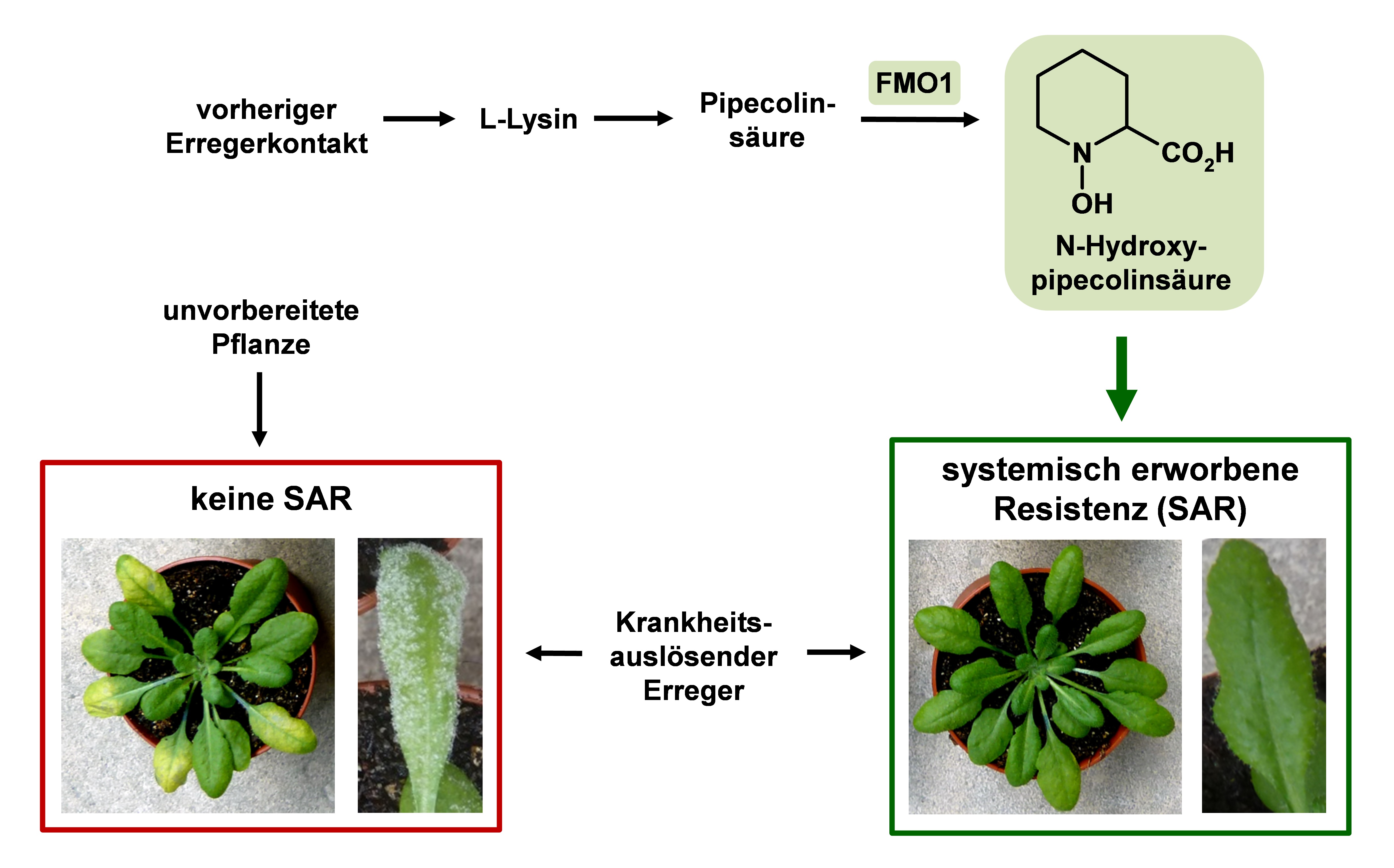 Aktuelle Arbeiten der Düsseldorfer Biologen zeigen nun, dass die Pipecolinsäure in der Pflanze durch die FMO1-Monooxygenase zur N-Hydroxypipecolinsäure umgesetzt wird, die als aktives Derivat den SAR-Zustand auslöst. Es stellte sich heraus, dass schon eine geringe Menge an N-Hydroxypipecolinsäure – über das Erdsubstrat verabreicht – ausreicht, um sie praktisch vollständig vor Infektionen mit dem bakteriellen Blattflecken-Erreger Pseudomonas syringae oder dem falschen Mehltau Hyaloperonospora arabidopsidis – einem pilzähnlichen Erreger – zu schützen.