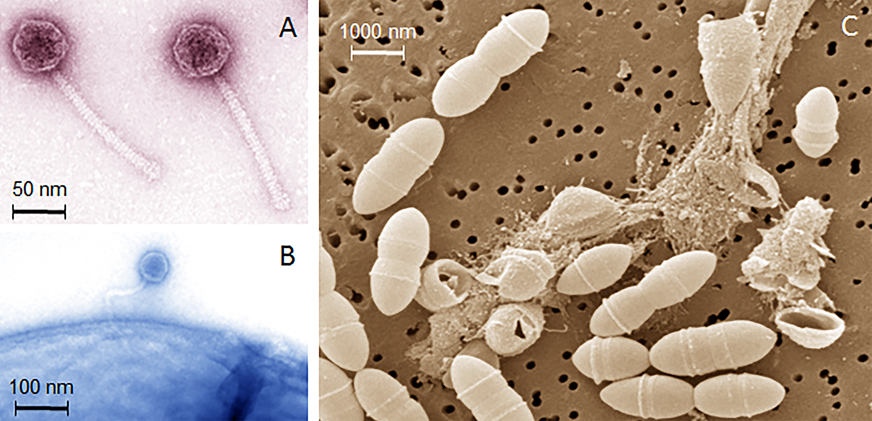 Bildunterschrift: Elektronenmikroskopische Aufnahmen (A) von Bakteriophagen der Milchsäurebakterien, (B) eines einzelnen Phagen nach der Anheftung (Adsorption) an die Zelloberfläche eines Milchsäurebakteriums und (C) von der beginnenden Zerstörung der Bakterienzellen durch die Phagen.