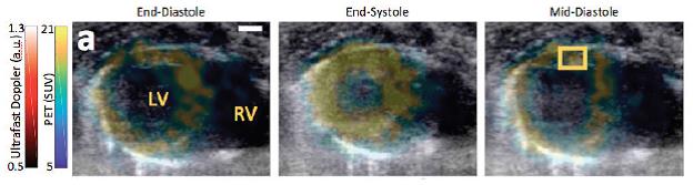 Aufnahme mit PETRUS (geschlossener Thorax) eines schlagenden Mäuseherzens in der parasternalen kurzen Achse. Zu sehen ist die Herzanatomie durch ultraschnelle Echographie (in schwarz/weiß) und die Stoffwechselaktivität des Herzmuskels links am Ende der Diastole, in der Mitte am Ende der Systole und rechts in der Mitte der Diastole. Bemerkenswert ist die perfekte Überlagerung des metabolischen Signals und der Herzmuskelwand. Jedes Bild entspricht dem durchschnittlichen Signal eines Zehntels der Dauer eines Herzzyklus. Maßstab: 1mm (Prevost J und al., Nature Biomedical Engineering)