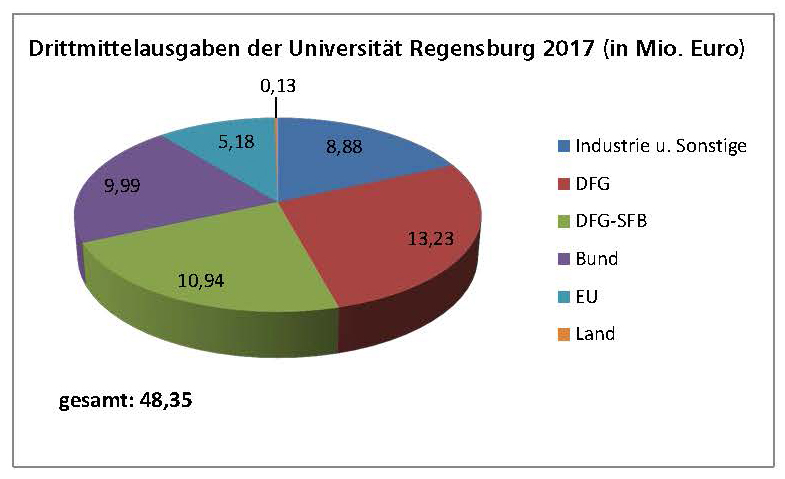 Bei den Drittmittelausgaben im Forschungsbereich konnte die Universität Regensburg auch 2017 eine spürbare Zunahme verzeichnen. Insgesamt wurden 48,35 Millionen Euro verausgabt, was im Vergleich zum Vorjahr einen Anstieg um beachtliche 7,2 Prozent (Gesamtausgaben 2016: 45,11 Millionen Euro) bedeutet. Damit setzt die Universität Regensburg die positive Entwicklung einer kontinuierlichen Steigerung der Drittmittelausgaben in den letzten zehn Jahren weiter fort.