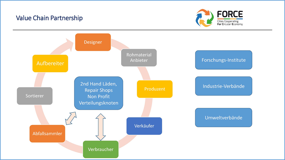 · Ein Governance-Modell für Städte basierend auf einer sogenannten „value-chain-partnership“ (Partnerschaft für die Wertschöpfung) soll bereitgestellt werden. Das Modell zielt auf die Vernetzung aller am Wertschöpfungskreislauf beteiligten Institutionen: vom Designer bis zum Müllsammler und Wiederverwerter.