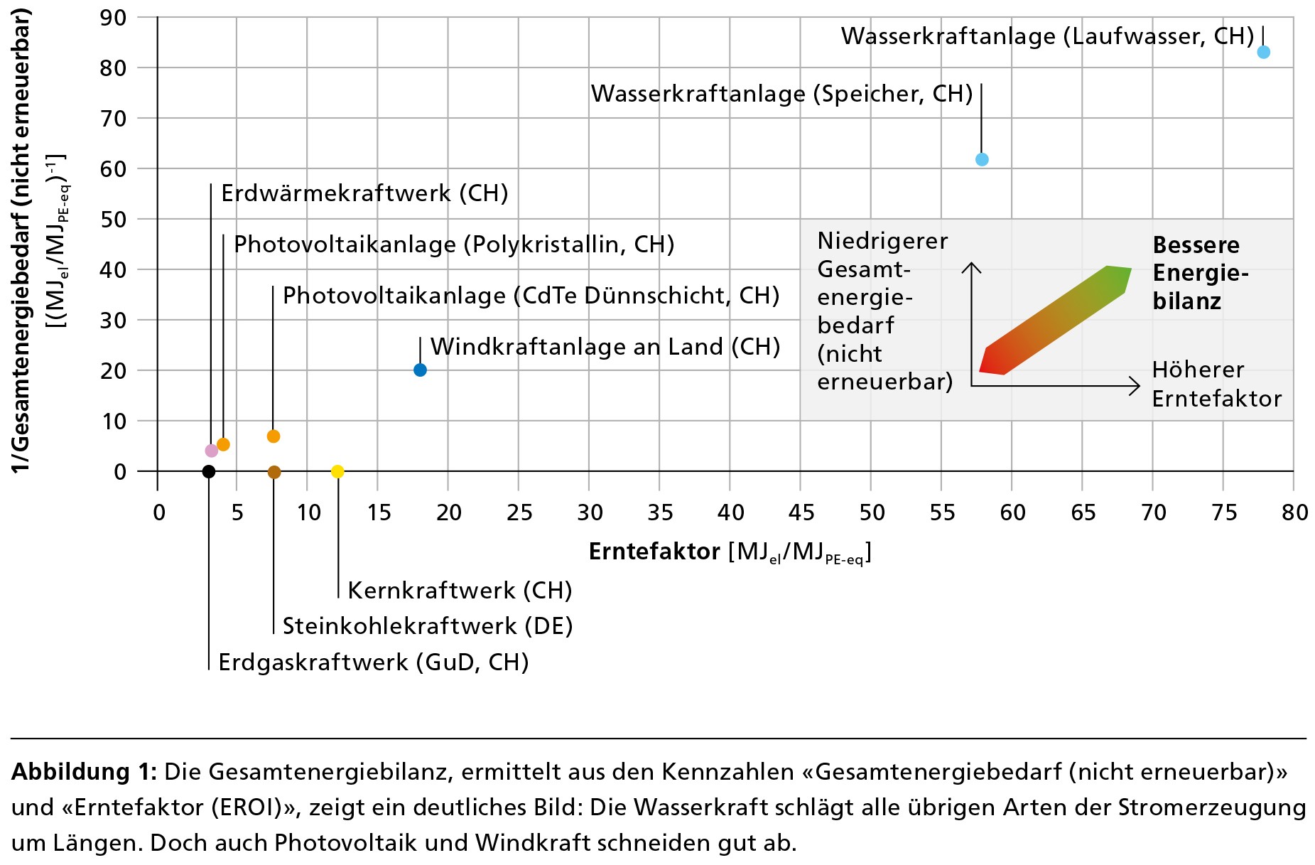 Die Gesamtenergiebilanz der Wasserkraft ist herausragend. Beeindruckend ist, wie deutlich sie die anderen Formen der Stromerzeugung beim Erntefaktor überflügelt. Die Analyse bekräftigt das Argument, die Wasserkraft als wichtigsten Pfeiler der Schweizerischen Stromversorgung unbedingt zu erhalten. Die Effizienz von Photovoltaik und Windkraft ist in den vergangenen Jahren deutlich gestiegen. Aufgrund der technologischen Lernkurve hat sich der Erntefaktor neuer erneuerbarer Energien in den letzten zehn Jahren stark erhöht und dürfte auch künftig weiter steigen. Öffentliche Förderprogramme tragen massgeblich zur positiven Entwicklung der neuen erneuerbaren Energien (und anderer Technologien) bei, auch punkto Gesamtenergiebilanz.