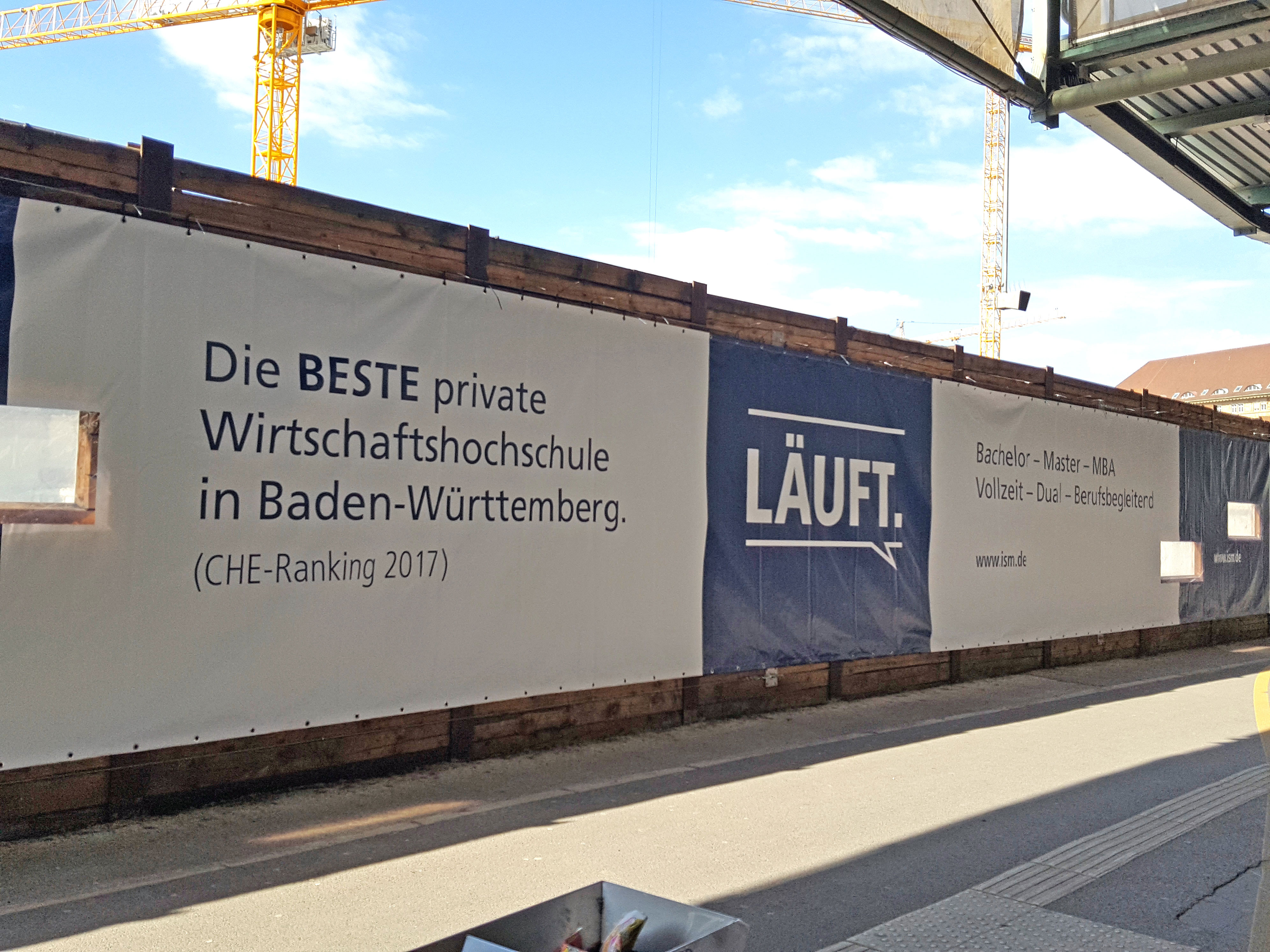 Mit Top-Ranking-Ergebnissen stellt die ISM Stuttgart die Weichen für die Zukunft! Erst kürzlich wurde der jüngste Standort der International School of Management (ISM) im CHE-Ranking 2017 zur besten privaten Wirtschaftshochschule in Baden-Württemberg gekürt. Ein Ergebnis, das sich sehen lassen kann: Daher platziert sich die ISM direkt am Stuttgarter Hauptbahnhof mit einem riesigen Banner inklusive CHE-Auszeichnung. Zu sehen ist die Werbekampagne vom 4. April bis zum 2. Mai 2018.