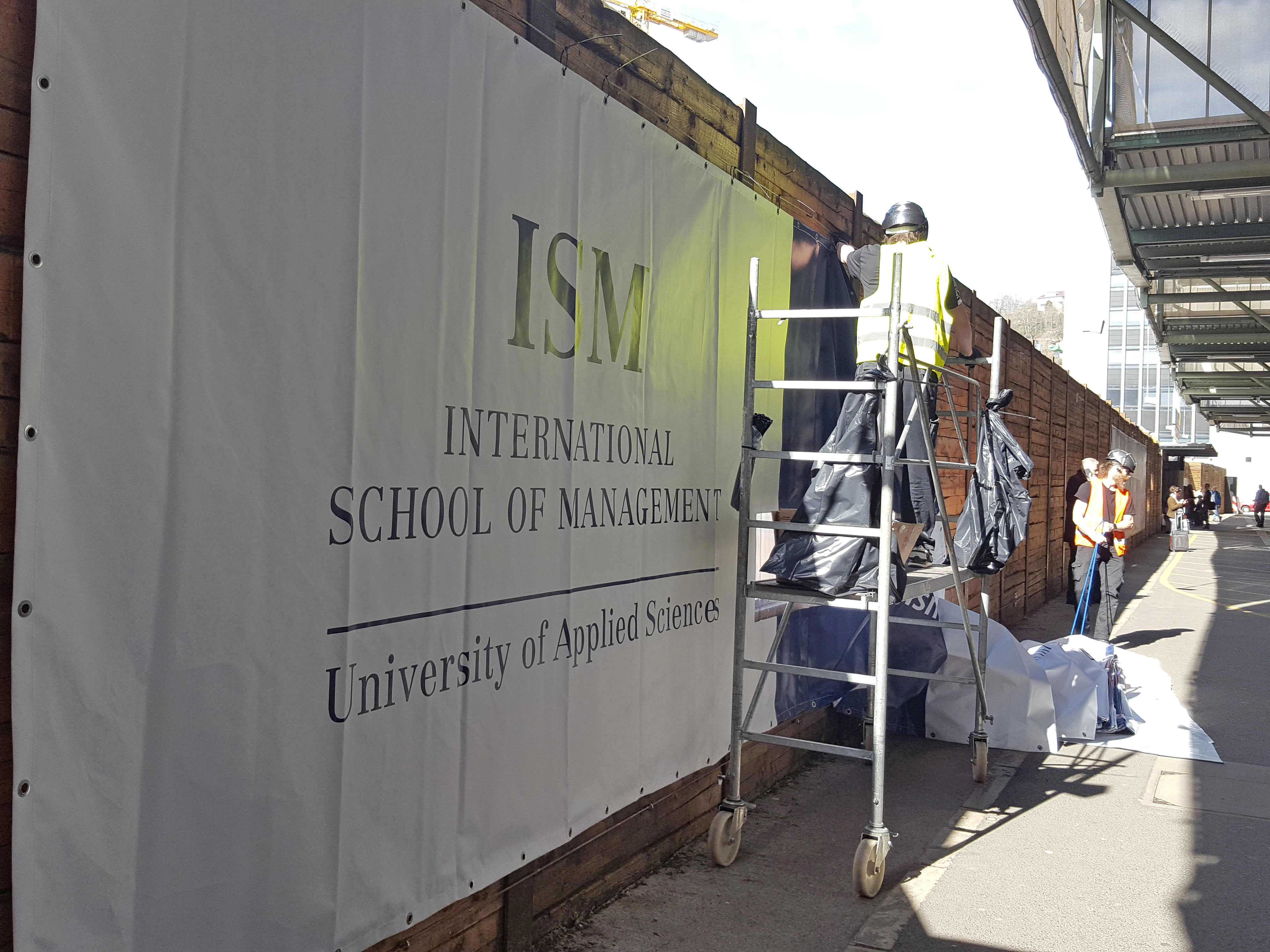 Auf insgesamt zwei Flächen wurde die ISM-Grafik am Stuttgarter Hauptbahnhof montiert - teilweise mit Fenstern, um den Blick auf die Baustelle von Stuttgart 21 zu ermöglichen: „Als Hochschule hat die ISM den Anspruch, sich kontinuierlich weiterzuentwickeln und am Puls der Zeit zu bleiben. Der Stuttgarter Hauptbahnhof, der selbst in ein Zukunftsprojekt involviert ist, ist daher der ideale Ort für die Banneraktion“, so Campusleiterin Prof. Dr. Cornelia Hattula.