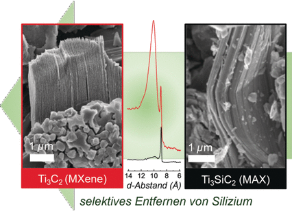 Um die begehrten MXene zu erhalten, muss man einen Umweg wählen: Aus schichtartig aufgebauten Carbiden bzw. Nitriden, die als MAX-Phasen bezeichnet werden, ätzt man mit Flusssäure selektiv die Schichten aus dem „A-Element“ heraus, einem Element der 3. oder 4. Hauptgruppe, beispielsweise Aluminium, Silicium oder Germanium. So lässt sich Titancarbid durch Herausätzen von Aluminium aus Titanaluminiumcarbid Ti3AlC2 gewinnen. Dieser Ausgangsstoff ist jedoch teuer und die Herstellung ist komplex. Das Silizium-Analogon Titansiliziumcarbid Ti3SiC2 ist dagegen kommerziell erhältlich und günstiger. Ti3SiC2 war die erste MAX-Phase, die Wissenschaftler der Drexel University 2011 selektiv mit Flusssäure ätzen wollten. Sie blieben jedoch erfolglos, da die Siliziumatome sehr fest an die benachbarten Übergangsmetallatome gebunden sind.