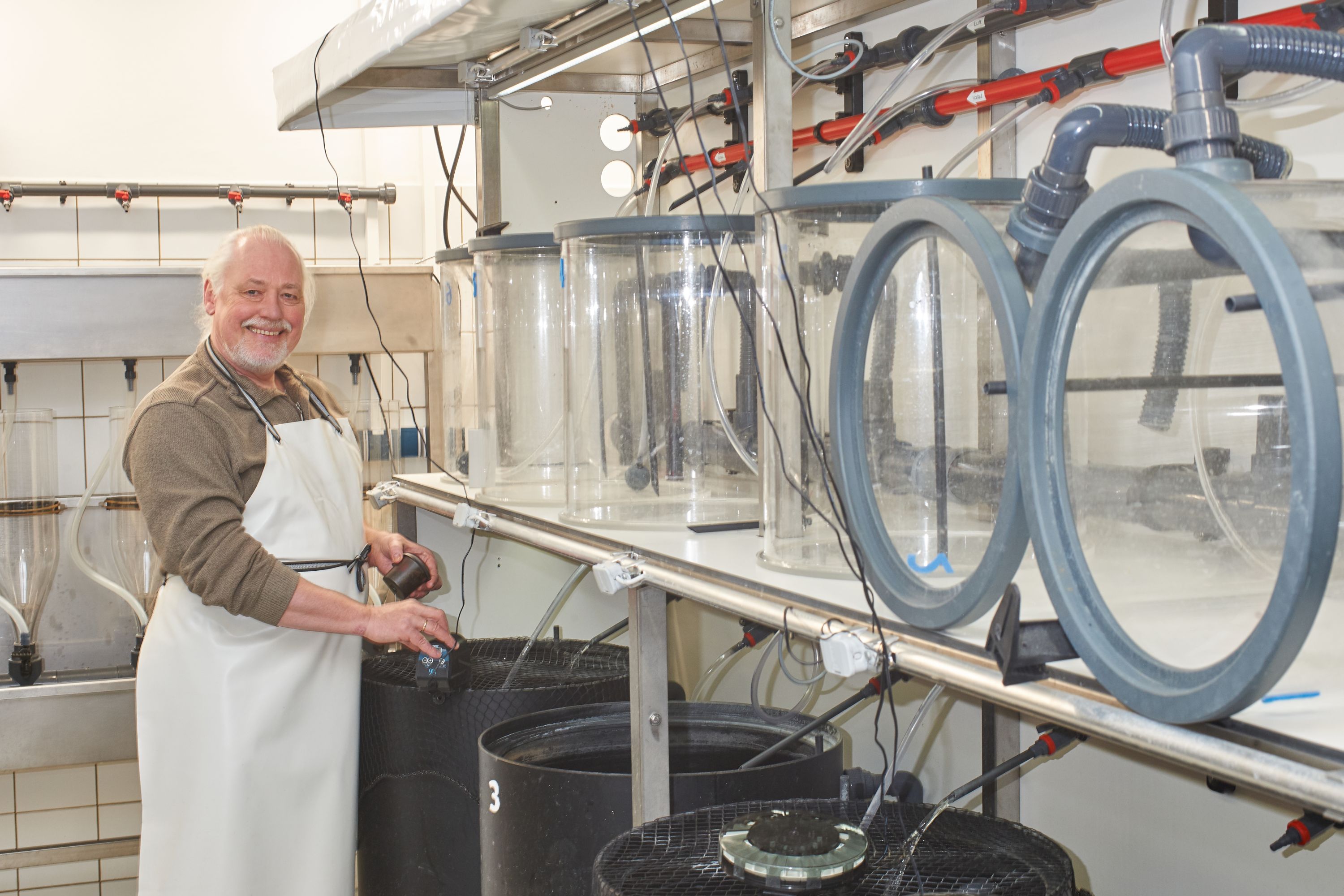 Jeden Morgen inspiziert Dr. Ronald Brunner die neue Anlage, prüft die Wasserwerte und Filter und füttert seine Schützlinge. Seit 1992 arbeitet er am FBN, seit zehn Jahren in der Fischgenetik.