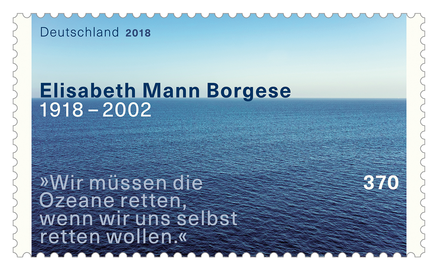 Elisabeth Mann Borgese, engagierte Meeresschützerin, Mitgründerin des „Club of Rome“ und Tochter von Literaturnobelpreisträger Thomas Mann, wäre dieses Jahr am 24. April 100 Jahre geworden. Aus diesem Anlass gibt das Bundesfinanzministerium am Donnerstag, den 12. April 2018, eine Gedenkbriefmarke heraus. Im Rahmen der Aktion „Briefmarken:Erlebnis“ richtet die Deutsche Post an diesem Tag von 10 – 16.30 Uhr ein Sonderpostamt in den Ausstellungsräumen des Leibniz-Instituts für Ostseeforschung Warnemünde (IOW) ein. Nur dort kann man die Briefmarke auf einem speziell gestalteten Briefumschlag mit einem besonderen Poststempel erwerben, der das IOW-Forschungsschiff „Elisabeth Mann Borgese“ zeigt.